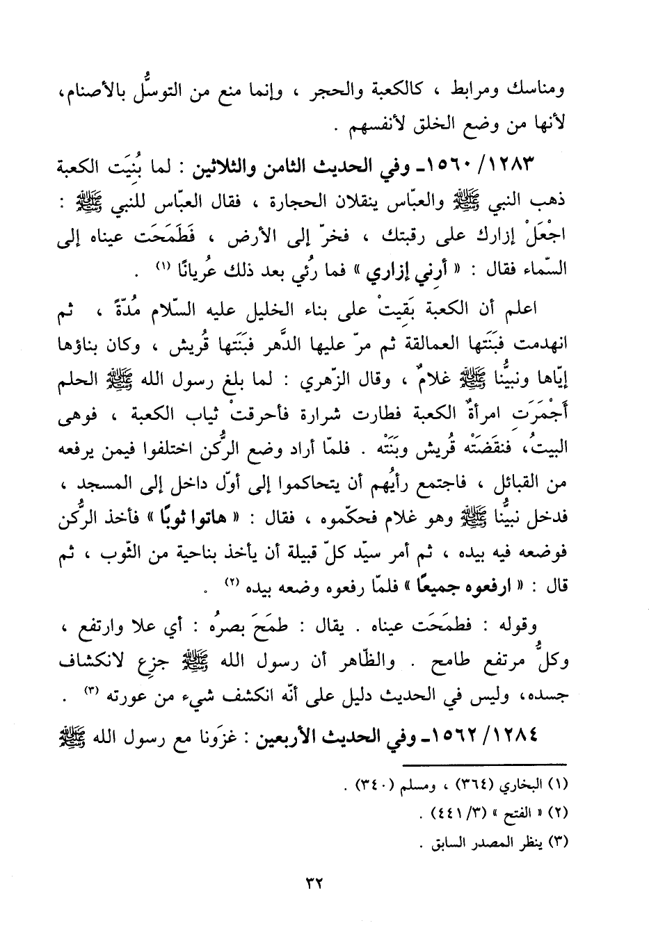 1283 - / 1560 - وَفِي الحَدِيث الثَّامِن وَالثَّلَاثِينَ: لما بنيت الْكَعْبَة ذهب النَّبِي صلى الله عَلَيْهِ وَسلم وَالْعَبَّاس ينقلان الْحِجَارَة، فَقَالَ الْعَبَّاس للنَّبِي صلى الله عَلَيْهِ وَسلم اجْعَل إزارك على رقبتك، فَخر إِلَى الأَرْض، فطمحت عَيناهُ إِلَى السَّمَاء فَقَالَ: ((أَرِنِي إزَارِي)) فَمَا رئي بعد ذَلِك عُريَانا.