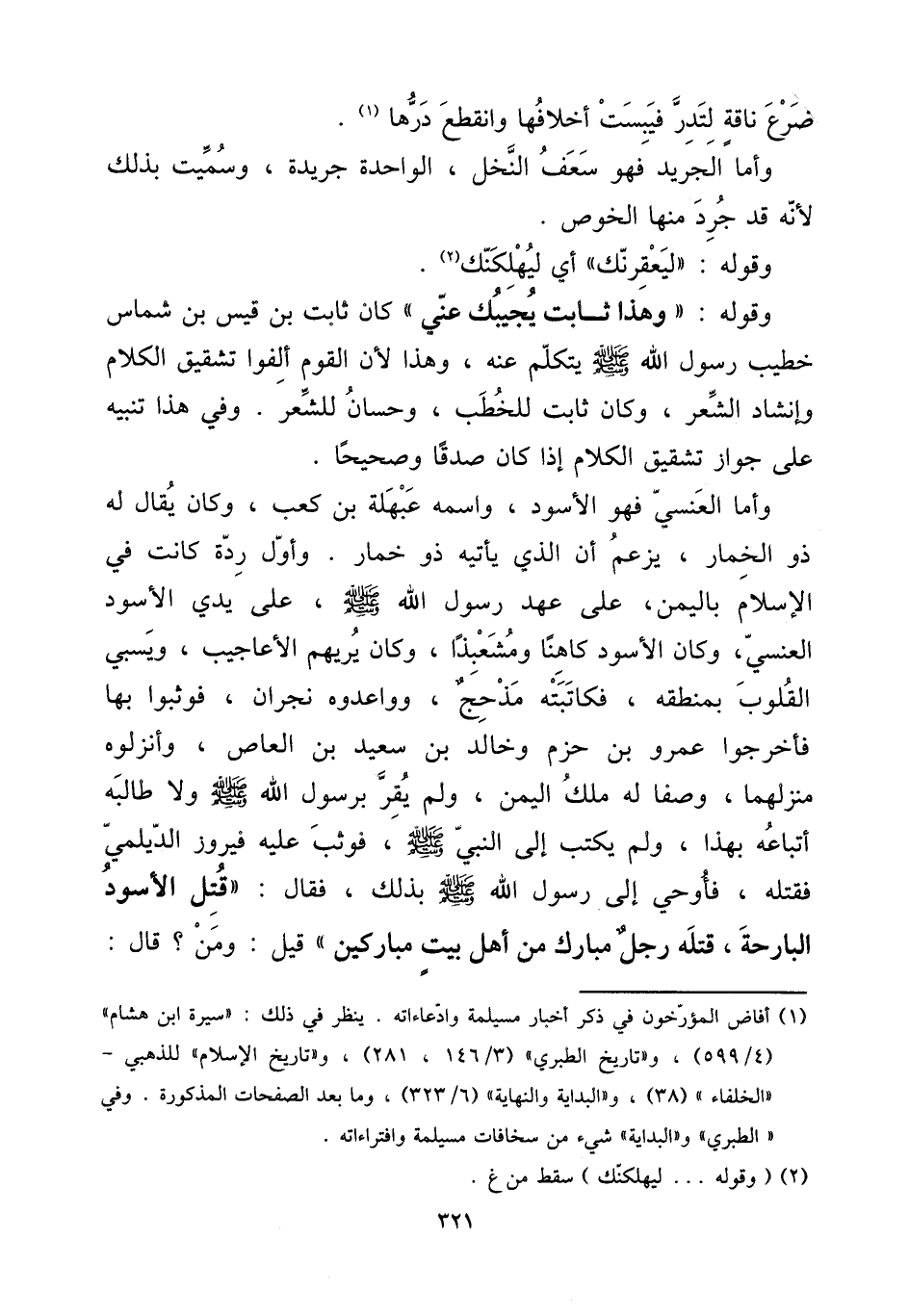 وَأما الْعَنسِي فَهُوَ الْأسود، واسْمه عبهلة بن كَعْب، وَكَانَ يُقَال لَهُ ذُو الْخمار، يزْعم أَن الَّذِي يَأْتِيهِ ذُو خمار. وَأول ردة كَانَت فِي الْإِسْلَام بِالْيمن، على عهد رَسُول الله صلى الله عَلَيْهِ وَسلم، على يَدي الْأسود الْعَنسِي، وَكَانَ الْأسود كَاهِنًا ومشعبذا، وَكَانَ يُرِيهم الْأَعَاجِيب، وَيَسْبِي الْقُلُوب بمنطقه، فكاتبته مذْحج، وواعدوه نَجْرَان، فَوَثَبُوا بهَا فأخرجوا عَمْرو بن حزم وخَالِد بن سعيد بن الْعَاصِ، وأنزلوه منزلهما، وَصفا لَهُ ملك الْيمن، وَلم يقر برَسُول الله صلى الله عَلَيْهِ وَسلم وَلَا طَالبه أَتْبَاعه بِهَذَا، وَلم يكْتب إِلَى النَّبِي صلى الله عَلَيْهِ وَسلم، فَوَثَبَ عَلَيْهِ فَيْرُوز الديلمي فَقتله، فَأُوحي إِلَى رَسُول الله صلى الله عَلَيْهِ وَسلم بذلك، فَقَالَ: ((قتل الْأسود البارحة، قَتله رجل مبارك من أهل بَيت مباركين)) قيل: وَمن؟ قَالَ: