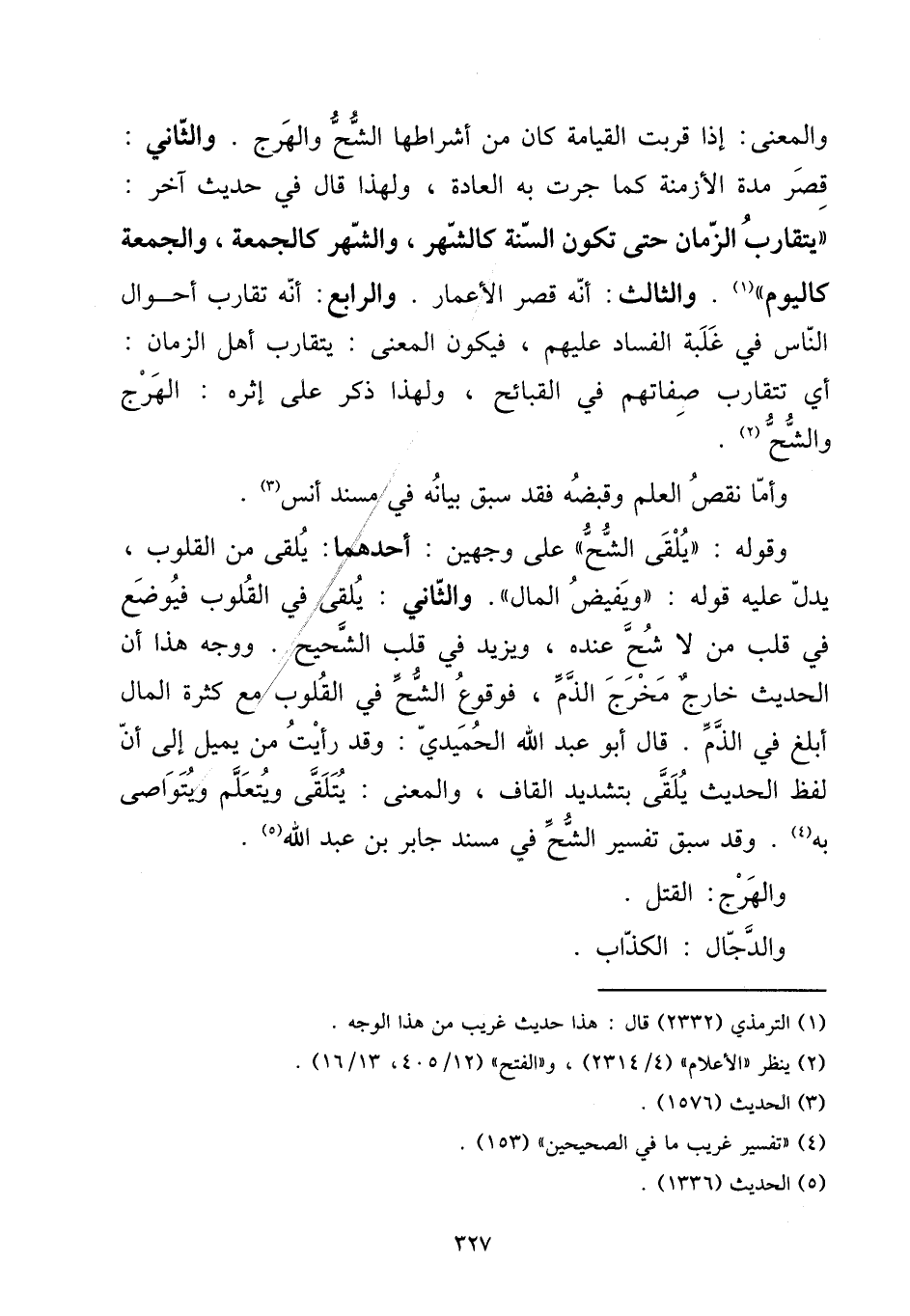 وَالْمعْنَى: إِذا قربت الْقِيَامَة كَانَ من أشراطها الشُّح والهرج. وَالثَّانِي: قصر مُدَّة الْأَزْمِنَة كَمَا جرت بِهِ الْعَادة، وَلِهَذَا قَالَ فِي حَدِيث آخر: ((يتقارب الزَّمَان حَتَّى تكون السّنة كالشهر، والشهر كَالْجُمُعَةِ، وَالْجُمُعَة كَالْيَوْمِ)) . وَالثَّالِث: أَنه قصر الْأَعْمَار. وَالرَّابِع: أَنه تقَارب أَحْوَال النَّاس فِي غَلَبَة الْفساد عَلَيْهِم، فَيكون الْمَعْنى: يتقارب أهل الزَّمَان: أَي تتقارب صفاتهم فِي القبائح، وَلِهَذَا ذكر على إثره: الْهَرج وَالشح.