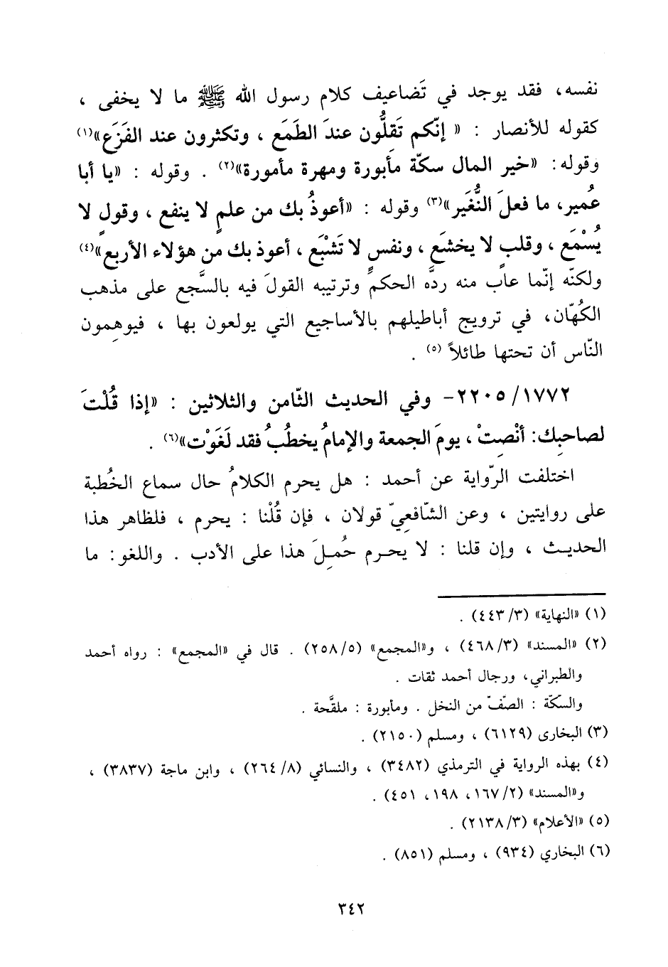 نَفسه، فقد يُوجد فِي تضاعيف كَلَام رَسُول الله صلى الله عَلَيْهِ وَسلم مَا لَا يخفى، كَقَوْلِه للْأَنْصَار: ((إِنَّكُم تقلون عِنْد الطمع، وتكثرون عِنْد الْفَزع)) وَقَوله: ((خير المَال سكَّة مأبورة ومهرة مأمورة)) . وَقَوله: ((يَا أَبَا عُمَيْر، مَا فعل النغير)) وَقَوله: ((أعوذ بك من علم لَا ينفع، وَقَول لَا يسمع، وقلب لَا يخشع، وَنَفس لَا تشبع، أعوذ بك من هَؤُلَاءِ الْأَرْبَع)) وَلكنه إِنَّمَا عَابَ مِنْهُ رده الحكم وترتيبه القَوْل فِيهِ بالسجع على مَذْهَب الْكُهَّان، فِي ترويج أباطيلهم بالأساجيع الَّتِي يولعون بهَا، فيوهمون النَّاس أَن تحتهَا طائلا.