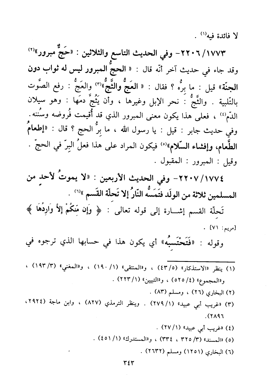 1773 - / 2206 - وَفِي الحَدِيث التَّاسِع وَالثَّلَاثِينَ: ((حج مبرور)) وَقد جَاءَ فِي حَدِيث آخر أَنه قَالَ: ((الْحَج المبرور لَيْسَ لَهُ ثَوَاب دون الْجنَّة)) قيل: مَا بره؟ فَقَالَ: ((العج والثج)) والعج: رفع الصَّوْت بِالتَّلْبِيَةِ. والثج: نحر الْإِبِل وَغَيرهَا، وَأَن يثج دَمهَا: وَهُوَ سيلان الدَّم، فعلى هَذَا يكون معنى المبرور الَّذِي قد أُقِيمَت فروضه وسننه.