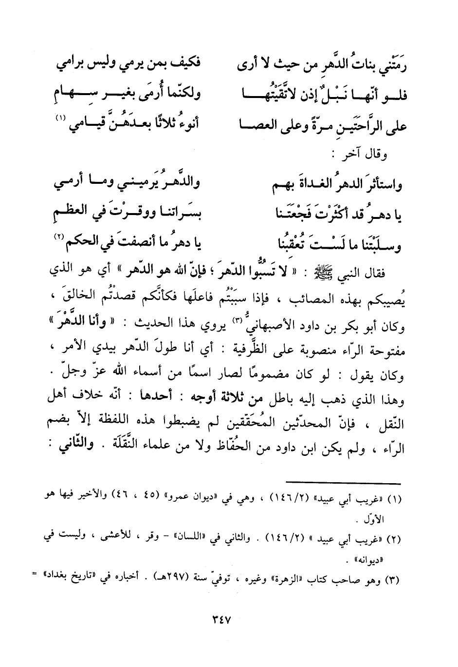 فَقَالَ النَّبِي صلى الله عَلَيْهِ وَسلم: ((لَا تسبوا الدَّهْر؛ فَإِن الله هُوَ الدَّهْر)) أَي هُوَ الَّذِي يُصِيبكُم بِهَذِهِ المصائب، فَإِذا سببتم فاعلها فكأنكم قصدتم الْخَالِق، وَكَانَ أَبُو بكر بن دَاوُد الْأَصْبَهَانِيّ يروي هَذَا الحَدِيث: ((وَأَنا الدَّهْر)) مَفْتُوحَة الرَّاء مَنْصُوبَة على الظَّرْفِيَّة: أَي أَنا طول الدَّهْر بيَدي الْأَمر، وَكَانَ يَقُول: لَو كَانَ مضموما لصار اسْما من أَسمَاء الله عز وَجل.
