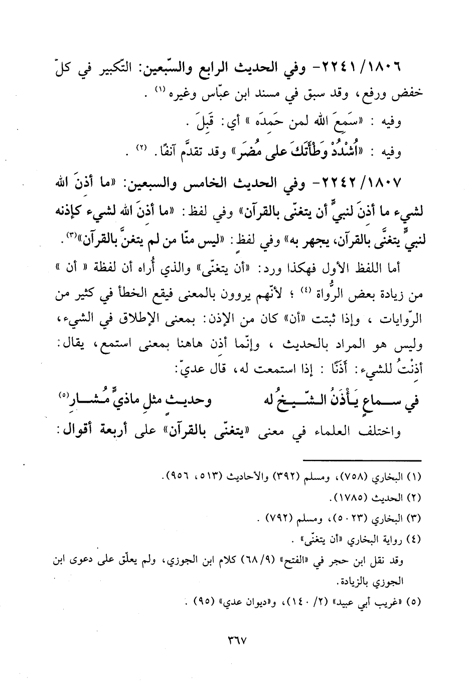 1807 - / 2242 - وَفِي الحَدِيث الْخَامِس وَالسبْعين: ((مَا أذن الله لشَيْء مَا أذن لنَبِيّ أَن يتَغَنَّى بِالْقُرْآنِ)) وَفِي لفظ: ((مَا أذن الله لشَيْء كَإِذْنِهِ لنَبِيّ يتَغَنَّى بِالْقُرْآنِ، يجْهر بِهِ)) وَفِي لفظ: ((لَيْسَ منا من لم يَتَغَنَّ بِالْقُرْآنِ)) .