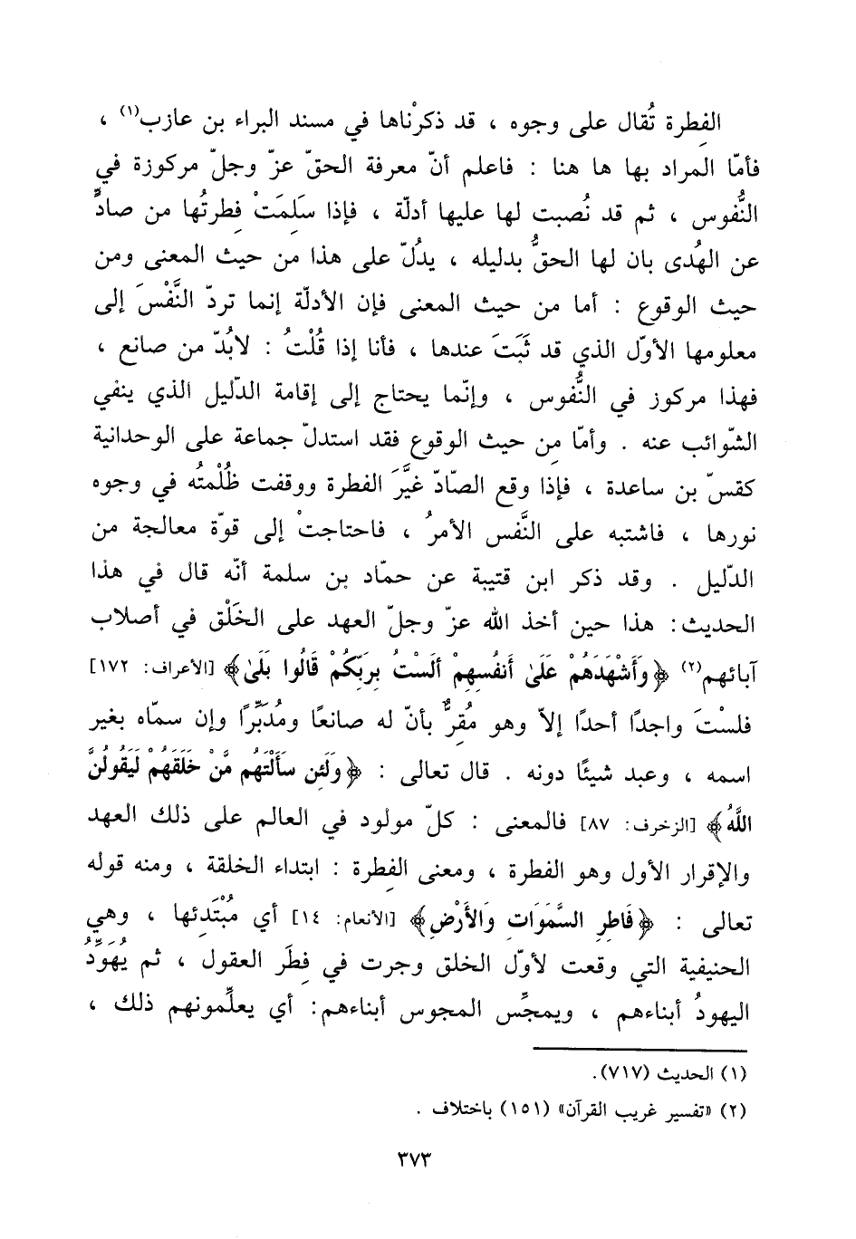 الْفطْرَة تقال على وُجُوه، قد ذَكرنَاهَا فِي مُسْند الْبَراء بن عَازِب، فَأَما المُرَاد بهَا هَا هُنَا: فَاعْلَم أَن معرفَة الْحق عز وَجل مركوزة فِي النُّفُوس، ثمَّ قد نصبت لَهَا عَلَيْهَا أَدِلَّة، فَإِذا سلمت فطرتها من صَاد عَن الْهدى بَان لَهَا الْحق بدليله، يدل على هَذَا من حَيْثُ الْمَعْنى وَمن حَيْثُ الْوُقُوع: أما من حَيْثُ الْمَعْنى فَإِن الْأَدِلَّة إِنَّمَا ترد النَّفس إِلَى معلومها الأول الَّذِي قد ثَبت عِنْدهَا، فَأَنا إِذا قلت: لَا بُد من صانع، فَهَذَا مركوز فِي النُّفُوس، وَإِنَّمَا يحْتَاج إِلَى إِقَامَة الدَّلِيل الَّذِي يَنْفِي الشوائب عَنهُ. وَأما من حَيْثُ الْوُقُوع فقد اسْتدلَّ جمَاعَة على الوحدانية كقس بن سَاعِدَة، فَإِذا وَقع الصَّاد غير الْفطْرَة ووقفت ظلمته فِي وُجُوه نورها، فَاشْتَبَهَ على النَّفس الْأَمر، فاحتاجت إِلَى قُوَّة معالجة من الدَّلِيل. وَقد ذكر ابْن قُتَيْبَة عَن حَمَّاد بن سَلمَة أَنه قَالَ فِي هَذَا الحَدِيث: هَذَا حِين أَخذ الله عز وَجل الْعَهْد على الْخلق فِي أصلاب آبَائِهِم {وأشهدهم على أنفسهم أَلَسْت بربكم قَالُوا بلَى} [الْأَعْرَاف: 172] فلست واجدا أحدا إِلَّا وَهُوَ مقرّ بِأَن لَهُ صانعا ومدبرا وَإِن سَمَّاهُ بِغَيْر اسْمه، وَعبد شَيْئا دونه. قَالَ تَعَالَى: {وَلَئِن سَأَلتهمْ من خلقهمْ ليَقُولن الله} [الزخرف: 87] فَالْمَعْنى: كل مَوْلُود فِي الْعَالم على ذَلِك الْعَهْد وَالْإِقْرَار الأول وَهُوَ الْفطْرَة، وَمعنى الْفطْرَة: ابْتِدَاء الْخلقَة، وَمِنْه قَوْله تَعَالَى: {فاطر السَّمَاوَات وَالْأَرْض} [الْأَنْعَام: 14] أَي مبتدئها، وَهِي الحنيفية الَّتِي وَقعت لأوّل الْخلق وَجَرت فِي فطر الْعُقُول، ثمَّ يهود الْيَهُود أَبْنَاءَهُم، ويمجس الْمَجُوس أَبْنَاءَهُم: أَي يعلمونهم ذَلِك،