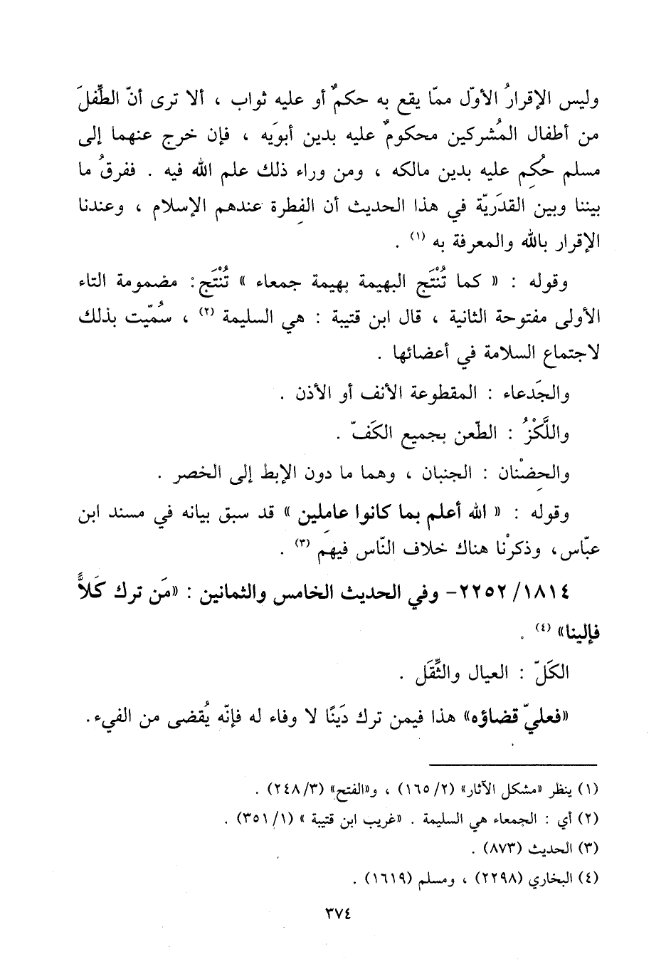 وَقَوله: ((كَمَا تنْتج الْبَهِيمَة بَهِيمَة جَمْعَاء)) تنْتج: مَضْمُومَة التَّاء الأولى مَفْتُوحَة الثَّانِيَة، قَالَ ابْن قُتَيْبَة: هِيَ السليمة، سميت بذلك لإجتماع السَّلامَة فِي أعضائها.