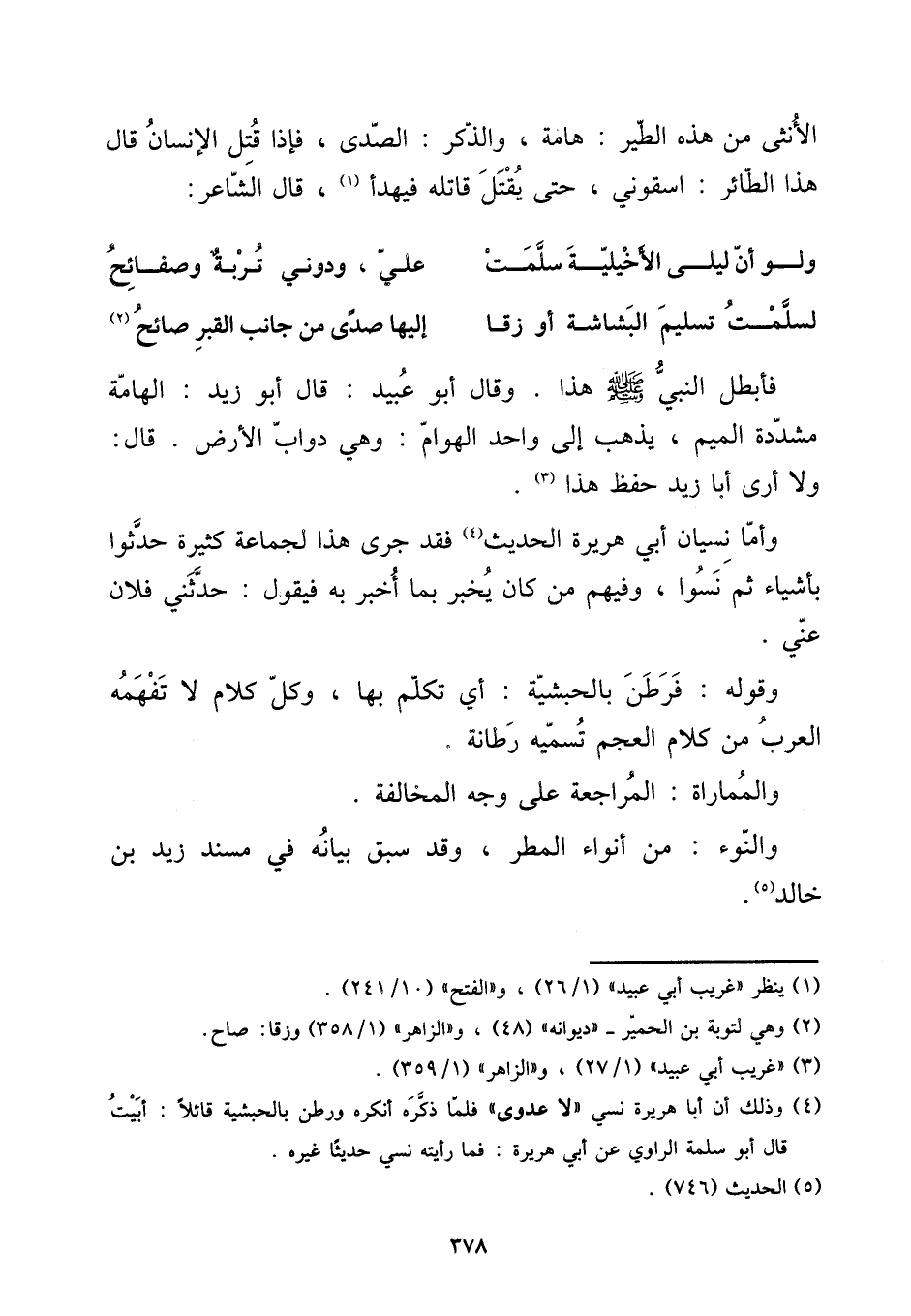 فَأبْطل النَّبِي صلى الله عَلَيْهِ وَسلم هَذَا. وَقَالَ أَبُو عبيد: قَالَ أَبُو زيد: الهامة مُشَدّدَة الْمِيم، يذهب إِلَى وَاحِد الْهَوَام: وَهِي دَوَاب الأَرْض. قَالَ: وَلَا أرى أَبَا زيد حفظ هَذَا.