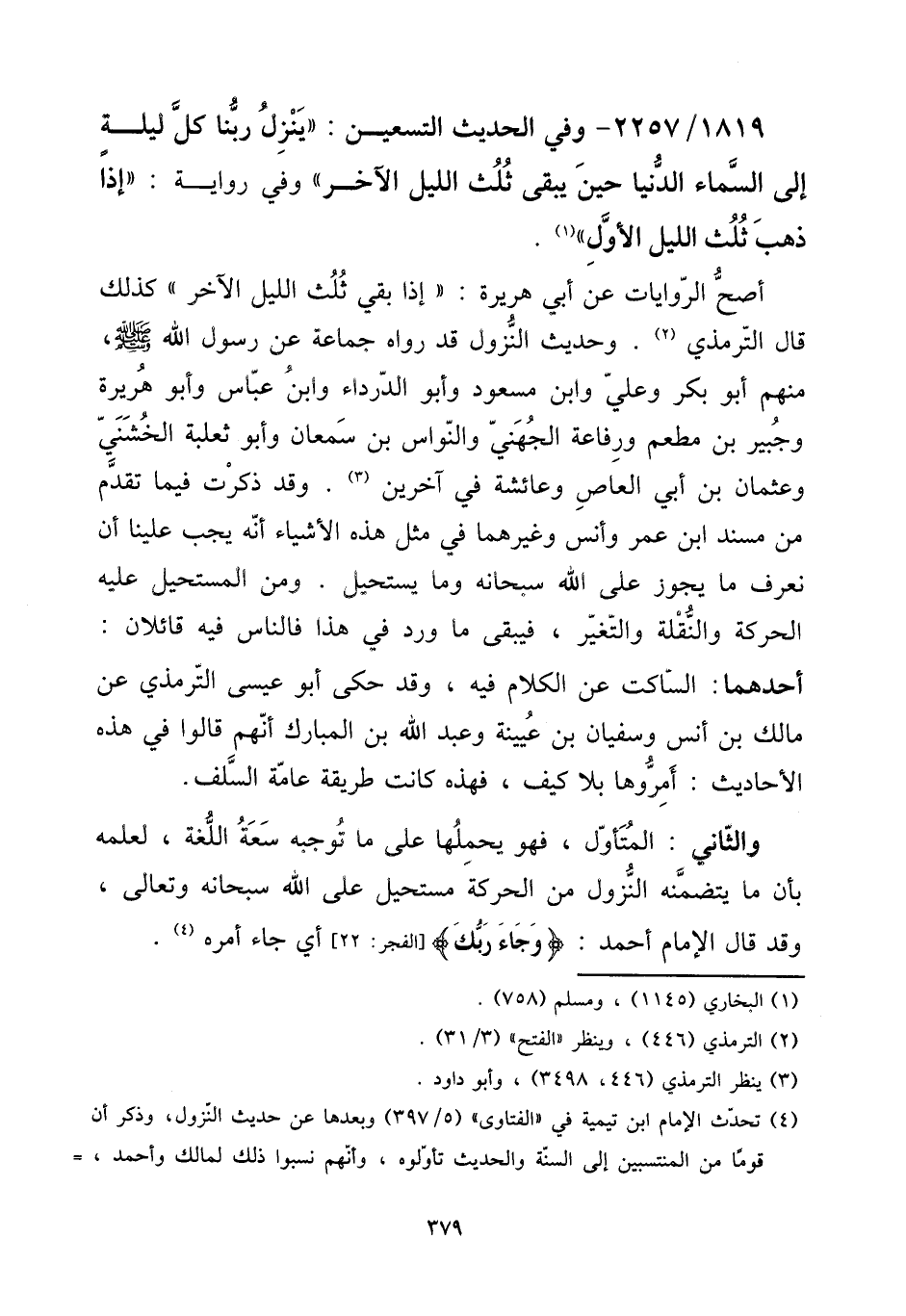أصح الرِّوَايَات عَن أبي هُرَيْرَة: ((إِذا بَقِي ثلث اللَّيْل الآخر)) كَذَلِك قَالَ التِّرْمِذِيّ. وَحَدِيث النُّزُول قد رَوَاهُ جمَاعَة عَن رَسُول الله صلى الله عَلَيْهِ وَسلم، مِنْهُم أَبُو بكر وَعلي وَابْن مَسْعُود وَأَبُو الدَّرْدَاء وَابْن عَبَّاس وَأَبُو هُرَيْرَة وَجبير بن مطعم وَرِفَاعَة الْجُهَنِيّ والنواس بن سمْعَان وَأَبُو ثَعْلَبَة الْخُشَنِي وَعُثْمَان بن أبي الْعَاصِ وَعَائِشَة فِي آخَرين. وَقد ذكرت فِيمَا تقدم من مُسْند ابْن عمر وَأنس وَغَيرهمَا فِي مثل هَذِه الْأَشْيَاء أَنه يجب علينا أَن نَعْرِف مَا يجوز على الله سُبْحَانَهُ وَمَا يَسْتَحِيل. وَمن المستحيل عَلَيْهِ الْحَرَكَة والنقلة والتغير، فَيبقى مَا ورد فِي هَذَا فَالنَّاس فِيهِ قائلان: أَحدهمَا: السَّاكِت عَن الْكَلَام فِيهِ، وَقد حكى أَبُو عِيسَى التِّرْمِذِيّ عَن مَالك بن أنس وسُفْيَان بن عُيَيْنَة وَعبد الله بن الْمُبَارك أَنهم قَالُوا فِي هَذِه الْأَحَادِيث: أمروها بِلَا كَيفَ، فَهَذِهِ كَانَت طَريقَة عَامَّة السّلف.