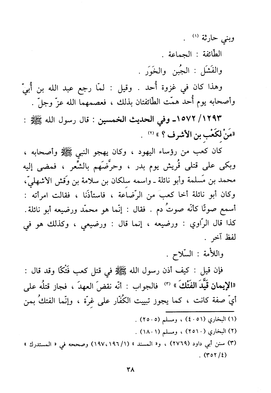 فَإِن قيل: كَيفَ أذن رَسُول الله صلى الله عَلَيْهِ وَسلم فِي قتل كَعْب فتكا وَقد قَالَ: ((الْإِيمَان قيد الفتك)) فَالْجَوَاب: أَنه نقض الْعَهْد، فَجَاز قَتله على أَي صفة كَانَت، كَمَا يجوز تبييت الْكفَّار على غرَّة، وَإِنَّمَا الفتك بِمن