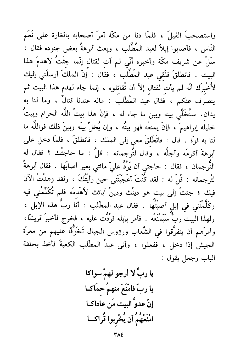 واستصحب الْفِيل، فَلَمَّا دنا من مَكَّة أَمر أَصْحَابه بالغارة على نعم النَّاس، فَأَصَابُوا إبِلا لعبد الْمطلب، وَبعث أَبْرَهَة بعض جُنُوده فَقَالَ: سل عَن شرِيف مَكَّة وَأخْبرهُ أَنِّي لم آتٍ لقِتَال إِنَّمَا جِئْت لأهدم هَذَا الْبَيْت. فَانْطَلق فلقي عبد الْمطلب، فَقَالَ: إِن الْملك أَرْسلنِي إِلَيْك لأخبرك أَنه لم يَأْتِ لقِتَال إِلَّا أَن تقاتلوه، إِنَّمَا جَاءَ لهدم هَذَا الْبَيْت ثمَّ ينْصَرف عَنْكُم، فَقَالَ عبد الْمطلب: مَاله عندنَا قتال، وَمَا لنا بِهِ يدان، سنخلي بَينه وَبَين مَا جَاءَ لَهُ، فَإِن هَذَا بَيت الله الْحَرَام وَبَيت خَلِيله إِبْرَاهِيم، فَإِن يمنعهُ فَهُوَ بَيته، وَإِن يخل بَينه وَبَين ذَلِك فوَاللَّه مَا لنا بِهِ قُوَّة. قَالَ: فَانْطَلق معي إِلَى الْملك، فَانْطَلق، فَلَمَّا دخل على أَبْرَهَة أكْرمه وأجله، وَقَالَ لِترْجُمَانِهِ: قل: مَا حَاجَتك؟ فَقَالَ لَهُ الترجمان، فَقَالَ: حَاجَتي أَن يرد عَليّ مِائَتي بعير أَصَابَهَا. فَقَالَ أَبْرَهَة لِترْجُمَانِهِ: قل لَهُ، لقد كنت أعجبتني حِين رَأَيْتُك، وَلَقَد زهدت الْآن فِيك؛ جِئْت إِلَى بَيت هُوَ دينك وَدين آبَائِك لأهدمه فَلم تكلمني فِيهِ وكلمتني فِي إبل أصبتها. فَقَالَ عبد الْمطلب: أَنا رب هَذِه الْإِبِل، وَلِهَذَا الْبَيْت رب سيمنعه. فَأمر بإبله فَردَّتْ عَلَيْهِ، فَخرج فَأخْبر قُريْشًا، وَأمرهمْ أَن يتفرقوا فِي الشعاب ورؤوس الْجبَال تخوفا عَلَيْهِم من معرة الْجَيْش إِذا دخل، فَفَعَلُوا، وأتى عبد الْمطلب الْكَعْبَة فَأخذ بِحَلقَة الْبَاب وَجعل يَقُول: