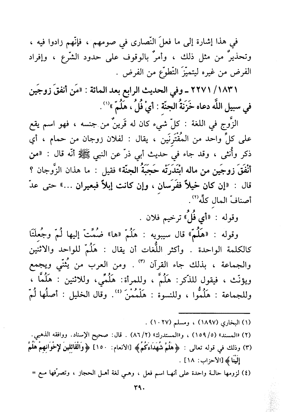 1831 - / 2271 - وَفِي الحَدِيث الرَّابِع بعد الْمِائَة: ((من أنْفق زَوْجَيْنِ فِي سَبِيل الله دَعَاهُ خَزَنَة الْجنَّة: أَي فل، هَلُمَّ)) .