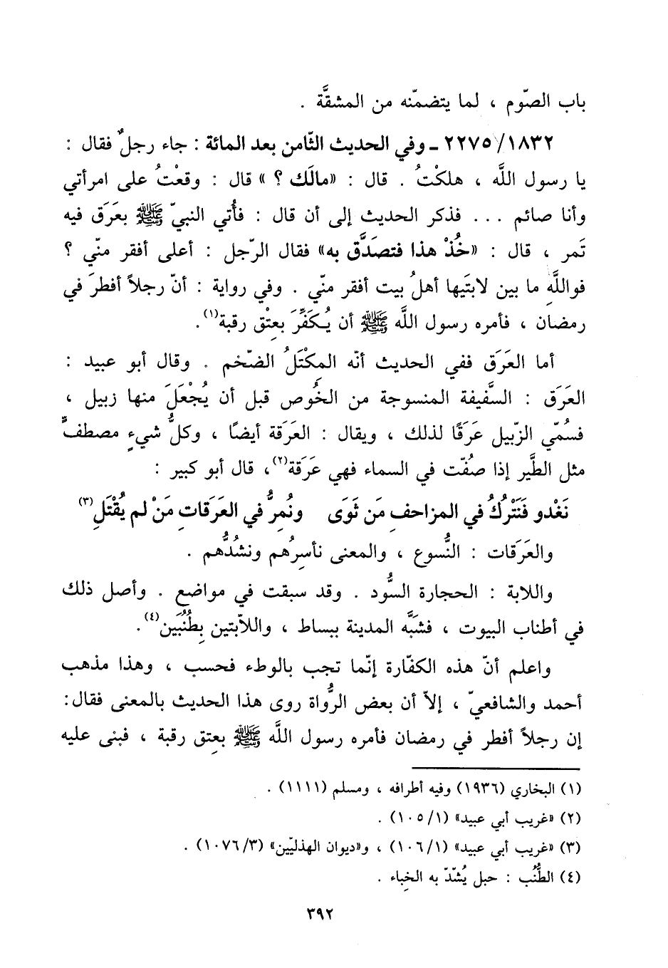 1832 - / 2275 - وَفِي الحَدِيث الثَّامِن بعد الْمِائَة: جَاءَ رجل فَقَالَ: يَا رَسُول الله، هَلَكت. قَالَ: ((مَالك؟)) قَالَ: وَقعت على امْرَأَتي وَأَنا صَائِم ... فَذكر الحَدِيث إِلَى أَن قَالَ: فَأتي النَّبِي صلى الله عَلَيْهِ وَسلم بعرق فِيهِ تمر، قَالَ: ((خُذ هَذَا فَتصدق بِهِ)) فَقَالَ الرجل: أَعلَى أفقر مني؟ فوَاللَّه مَا بَين لابتيها أهل بَيت أفقر مني. وَفِي رِوَايَة: أَن رجلا أفطر فِي رَمَضَان، فَأمره رَسُول الله صلى الله عَلَيْهِ وَسلم أَن يكفر بِعِتْق رَقَبَة.
