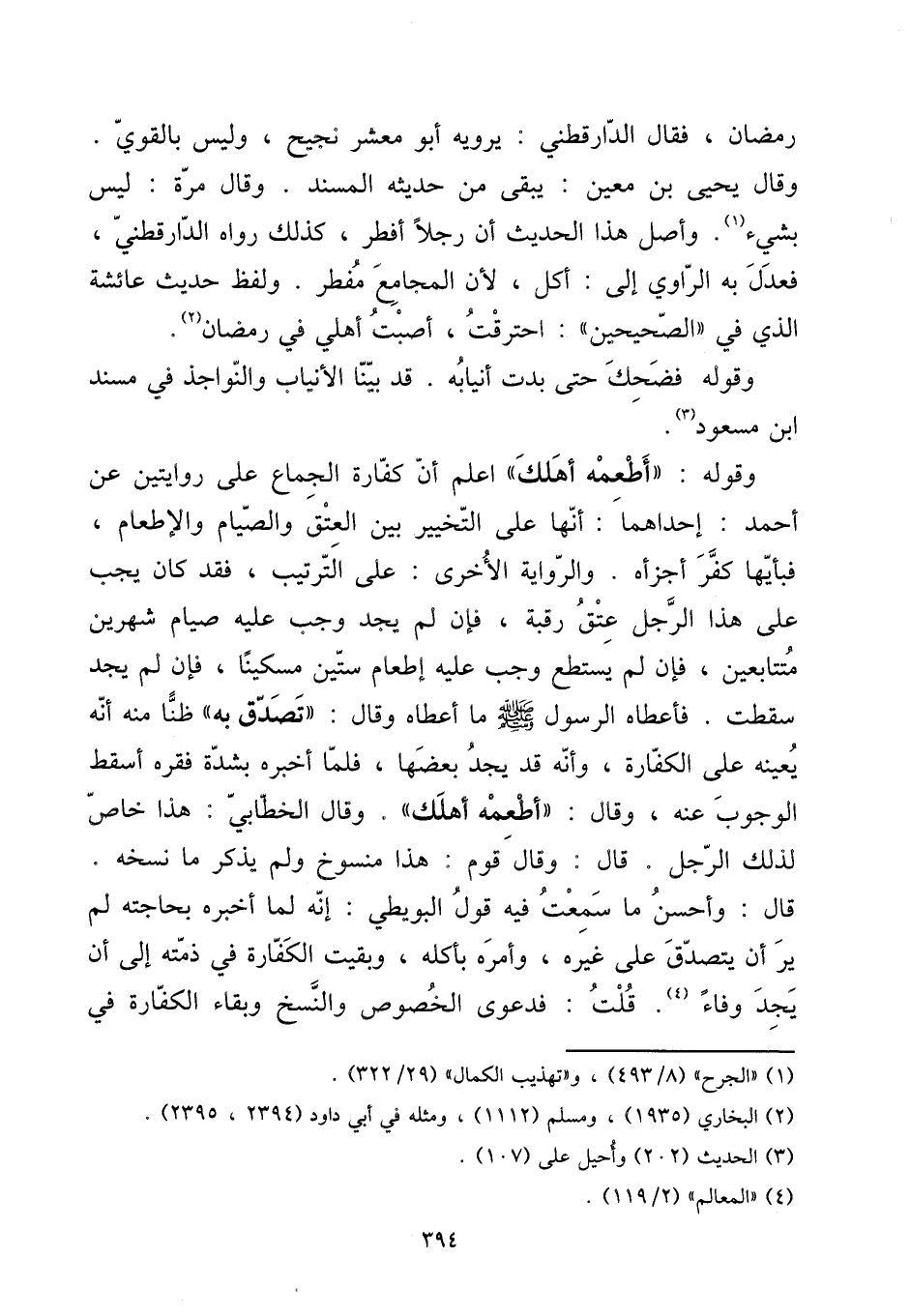 وَقَوله: ((أطْعمهُ أهلك)) اعْلَم أَن كَفَّارَة الْجِمَاع على رِوَايَتَيْنِ عَن أَحْمد: إِحْدَاهمَا: أَنَّهَا على التَّخْيِير بَين الْعتْق وَالصِّيَام وَالْإِطْعَام، فبأيها كفر أَجزَأَهُ. وَالرِّوَايَة الْأُخْرَى: على التَّرْتِيب، فقد كَانَ يجب على هَذَا الرجل عتق رَقَبَة، فَإِن لم يجد وَجب عَلَيْهِ صِيَام شَهْرَيْن مُتَتَابعين، فَإِن لم يسْتَطع وَجب عَلَيْهِ إطْعَام سِتِّينَ مِسْكينا، فَإِن لم يجد سَقَطت. فَأعْطَاهُ الرَّسُول صلى الله عَلَيْهِ وَسلم مَا أعطَاهُ وَقَالَ: ((تصدق بِهِ)) ظنا مِنْهُ أَنه يُعينهُ على الْكَفَّارَة، وَأَنه قد يجد بَعْضهَا، فَلَمَّا أخبرهُ بِشدَّة فقره أسقط الْوُجُوب عَنهُ، وَقَالَ: ((أطْعمهُ أهلك)) . وَقَالَ الْخطابِيّ: هَذَا خَاص لذَلِك الرجل. قَالَ: وَقَالَ قوم: هَذَا مَنْسُوخ وَلم يذكر مَا نسخه.
