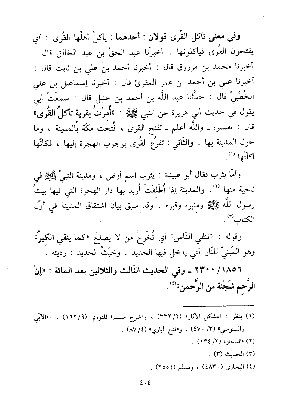 وَفِي معنى تَأْكُل الْقرى قَولَانِ: أَحدهمَا: يَأْكُل أَهلهَا الْقرى: أَي يفتحون الْقرى فيأكلونها. أخبرنَا عبد الْحق بن عبد الْخَالِق قَالَ: أخبرنَا مُحَمَّد لن مَرْزُوق قَالَ: أخبرنَا أَحْمد بن عَليّ بن ثَابت قَالَ: أخبرنَا عَليّ بن أَحْمد بن عمر الْمُقْرِئ قَالَ: أخبرنَا إِسْمَاعِيل بن عَليّ الخطبي قَالَ: حَدثنَا عبد الله بن أَحْمد بن حَنْبَل قَالَ: سَمِعت أبي يَقُول فِي حَدِيث أبي هُرَيْرَة عَن النَّبِي صلى الله عَلَيْهِ وَسلم: ((أمرت بقرية تَأْكُل الْقرى)) قَالَ: تَفْسِيره - وَالله أعلم - تفتح الْقرى، فتحت مَكَّة بِالْمَدِينَةِ، وَمَا حول الْمَدِينَة بهَا. وَالثَّانِي: تفرغ الْقرى بِوُجُوب الْهِجْرَة إِلَيْهَا، فَكَأَنَّهَا أكلتها.