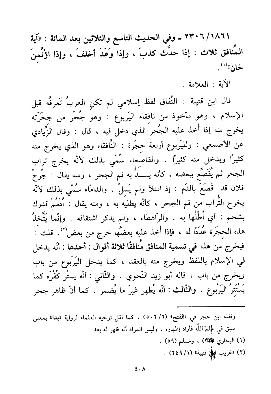 1861 - / 2306 - وَفِي الحَدِيث التَّاسِع وَالثَّلَاثِينَ بعد الْمِائَة: ((آيَة الْمُنَافِق ثَلَاث: إِذا حدث كذب، وَإِذا وعد أخلف، وَإِذا اؤتمن خَان)) .