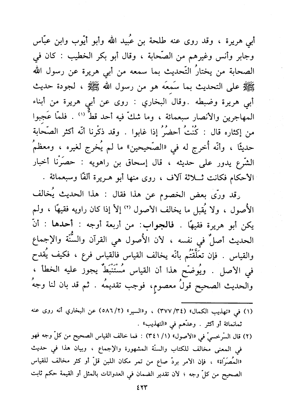 وَقد روى بعض الْخُصُوم عَن هَذَا فَقَالَ: هَذَا الحَدِيث يُخَالف الْأُصُول، وَلَا يقبل مَا يُخَالف الْأُصُول إِلَّا إِذا كَانَ رَاوِيه فَقِيها، وَلم يكن أَبُو هُرَيْرَة فَقِيها. فَالْجَوَاب: من أَرْبَعَة أوجه: أَحدهَا: أَن الحَدِيث أصل فِي نَفسه، لِأَن الْأُصُول هِيَ الْقُرْآن وَالسّنة وَالْإِجْمَاع وَالْقِيَاس. فَإِن تعلقتم بِأَنَّهُ يُخَالف الْقيَاس فَالْقِيَاس فرع، فَكيف يقْدَح فِي الأَصْل. ويوضح هَذَا أَن الْقيَاس مستنبط يجوز عَلَيْهِ الْخَطَأ، والْحَدِيث الصَّحِيح قَول مَعْصُوم، فَوَجَبَ تَقْدِيمه. ثمَّ قد بَان لنا وَجه
