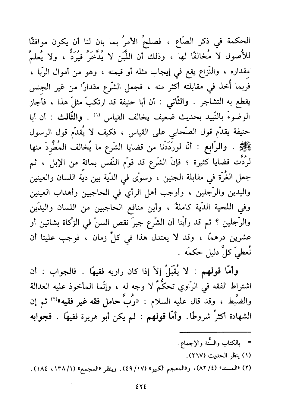 الْحِكْمَة فِي ذكر الصَّاع، فصلح الْأَمر بِمَا بَان لنا أَن يكون مُوَافقا لِلْأُصُولِ لَا مُخَالفا لَهَا، وَذَلِكَ أَن اللَّبن لَا يدّخر فَيرد، وَلَا يعلم مِقْدَاره، والنزاع يَقع فِي إِيجَاب مثله أَو قِيمَته، وَهُوَ من أَمْوَال الرِّبَا، فَرُبمَا أَخذ فِي مُقَابلَته أَكثر مِنْهُ، فَجعل الشَّرْع مِقْدَارًا من غير الْجِنْس يقطع بِهِ التشاجر. وَالثَّانِي: أَن أَبَا حنيفَة قد ارْتكب مثل هَذَا، فَأجَاز الْوضُوء بالنبيد بِحَدِيث ضَعِيف يُخَالف الْقيَاس. وَالثَّالِث: أَن أَبَا حنيفَة يقدم قَول الصَّحَابِيّ على الْقيَاس، فَكيف لَا يقدم قَول الرَّسُول صلى الله عَلَيْهِ وَسلم. وَالرَّابِع: أَنا لَو رددنا من قضايا الشَّرْع مَا يُخَالف المطرد مِنْهَا لردت قضايا كَثِيرَة؛ فَإِن الشَّرْع قد قوم النَّفس بِمِائَة من الْإِبِل، ثمَّ جعل الْغرَّة فِي مُقَابلَة الْجَنِين، وَسوى فِي الدِّيَة بَين دِيَة اللِّسَان والعينين وَالْيَدَيْنِ وَالرّجلَيْنِ، وَأوجب أهل الرَّأْي فِي الحاجبين وأهداب الْعَينَيْنِ وَفِي اللِّحْيَة الدِّيَة كَامِلَة، وَأَيْنَ مَنَافِع الحاجبين من اللِّسَان وَالْيَدَيْنِ وَالرّجلَيْنِ؟ ثمَّ قد رَأينَا أَن الشَّرْع جبر نقص السن فِي الزَّكَاة بشاتين أَو عشْرين درهما، وَقد لَا يعتدل هَذَا فِي كل زمَان، فَوَجَبَ علينا أَن نعطي كل دَلِيل حكمه.