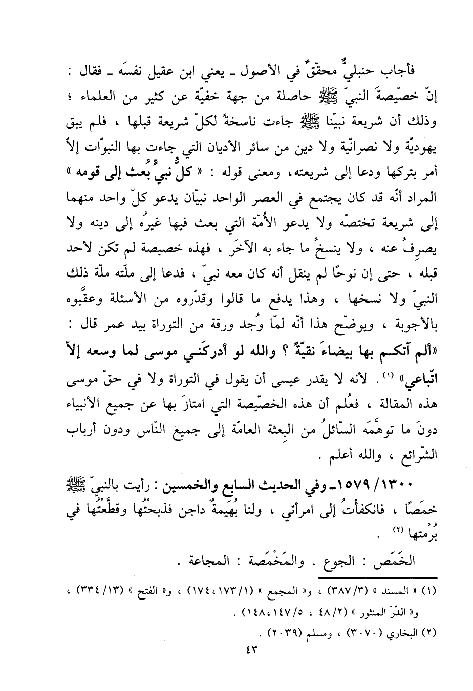 فَأجَاب حنبلي مُحَقّق فِي الْأُصُول - يَعْنِي ابْن عقيل نَفسه - فَقَالَ: إِن خصيصة النَّبِي صلى الله عَلَيْهِ وَسلم حَاصِلَة من جِهَة خُفْيَة عَن كثير من الْعلمَاء؛ وَذَلِكَ أَن شَرِيعَة نَبينَا صلى الله عَلَيْهِ وَسلم جَاءَت ناسخة لكل شَرِيعَة قبلهَا، فَلم يبْق يَهُودِيَّة وَلَا نَصْرَانِيَّة وَلَا دين من سَائِر الْأَدْيَان الَّتِي جَاءَت بهَا النبوات إِلَّا أَمر بِتَرْكِهَا ودعا إِلَى شَرِيعَته، وَمعنى قَوْله: ((كل نَبِي بعث إِلَى قومه)) المُرَاد أَنه قد كَانَ يجْتَمع فِي الْعَصْر الْوَاحِد نبيان يَدْعُو كل وَاحِد مِنْهُمَا إِلَى شَرِيعَة تختصه وَلَا يَدْعُو الْأمة الَّتِي بعث فِيهَا غَيره إِلَى دينه وَلَا يصرف عَنهُ، وَلَا ينْسَخ مَا جَاءَ بِهِ الآخر، فَهَذِهِ خصيصة لم تكن لأحد قبله، حَتَّى إِن نوحًا لم ينْقل أَنه كَانَ مَعَه نَبِي، فَدَعَا إِلَى مِلَّته مِلَّة ذَلِك النَّبِي وَلَا نسخهَا، وَهَذَا يدْفع مَا قَالُوا وقدروه من الأسئلة وعقبوه بالأجوبة، ويوضح هَذَا أَنه لما وجد ورقة من التَّوْرَاة بيد عمر قَالَ: ((ألم آتكم بهَا بيضًا نقية؟ وَالله لَو أدركني مُوسَى لما وَسعه إِلَّا اتباعي)) . لِأَنَّهُ لَا يقدر عِيسَى أَن يَقُول فِي التَّوْرَاة وَلَا فِي حق مُوسَى هَذِه الْمقَالة، فَعلم أَن هَذِه الخصيصة الَّتِي امتاز بهَا عَن جَمِيع الْأَنْبِيَاء دون مَا توهمه السَّائِل من الْبعْثَة الْعَامَّة إِلَى جَمِيع النَّاس وَدون أَرْبَاب الشَّرَائِع، وَالله أعلم.