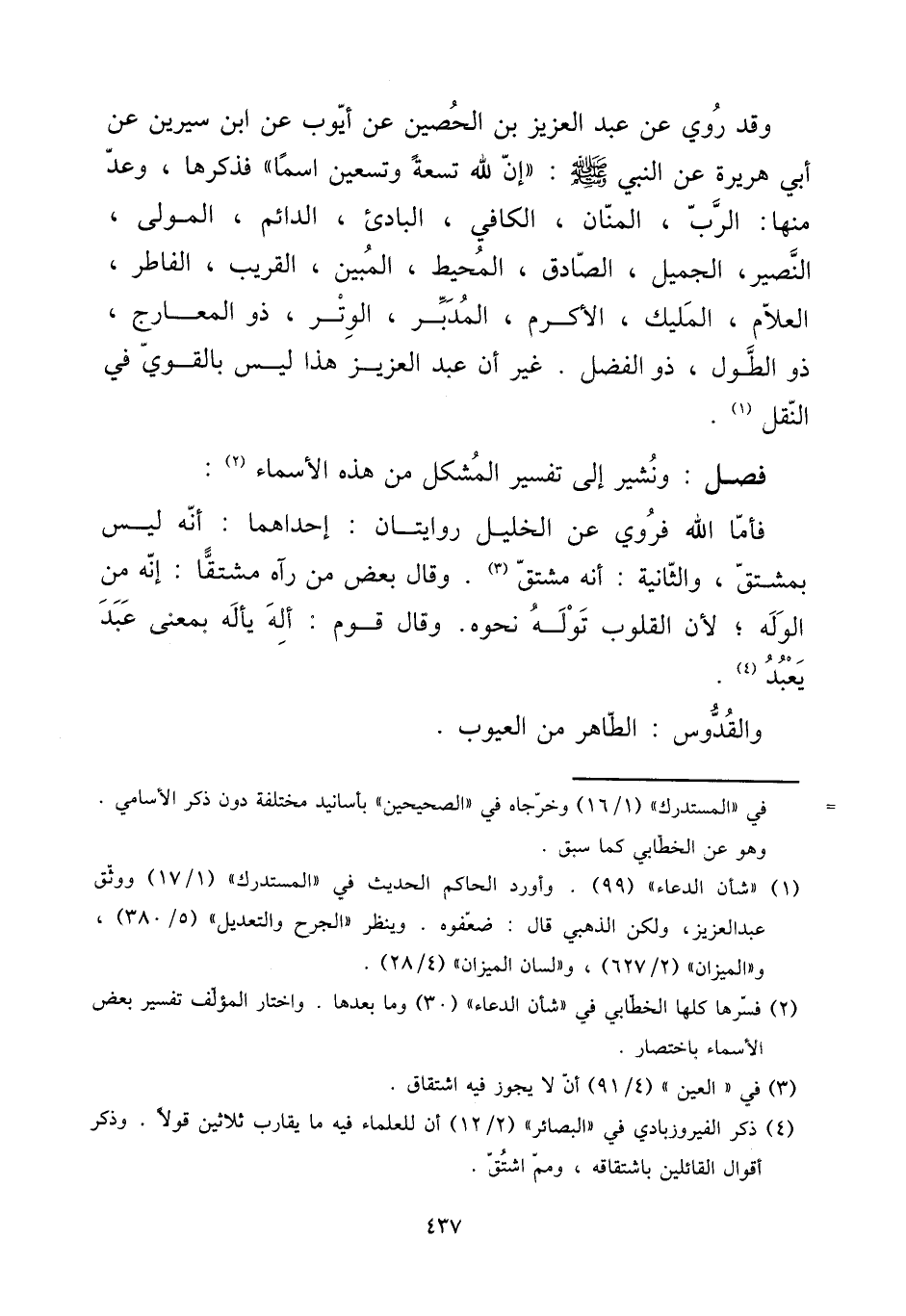 وَقد رُوِيَ عَن عبد الْعَزِيز بن الْحصين عَن أَيُّوب عَن ابْن سِيرِين عَن أبي هُرَيْرَة عَن النَّبِي صلى الله عَلَيْهِ وَسلم: (إِن لله تِسْعَة وَتِسْعين اسْما)) فَذكرهَا، وعد مِنْهَا: الرب، المنان، الْكَافِي، البادئ، الدَّائِم، الْمولى، النصير، الْجَمِيل، الصَّادِق، الْمُحِيط، الْمُبين، الْقَرِيب، الفاطر، العلام، المليك، الأكرم، الْمُدبر، الْوتر، ذُو المعارج، ذُو الطول، ذُو الْفضل. غير أَن عبد الْعَزِيز هَذَا لَيْسَ بِالْقَوِيّ فِي النَّقْل.