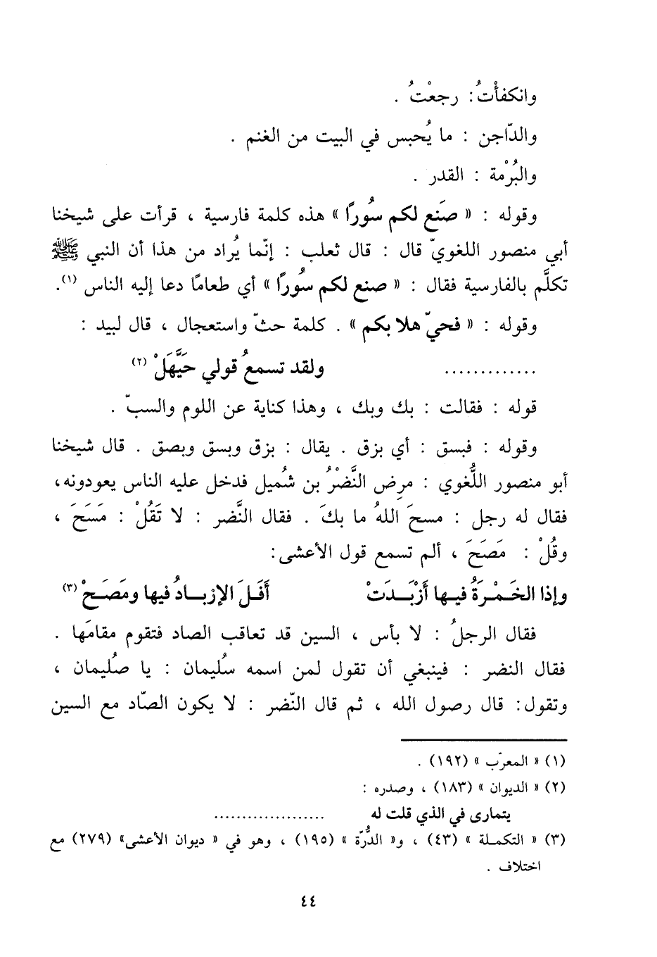 فَقَالَ النَّضر: فَيَنْبَغِي أَن تَقول لمن اسْمه سُلَيْمَان: يَا صليمان، وَتقول: قَالَ رصول الله، ثمَّ قَالَ النَّضر: لَا يكون الصَّاد مَعَ السِّين