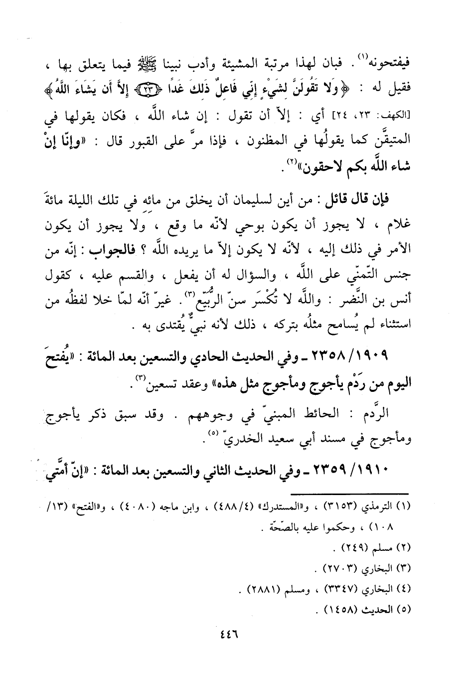 فَإِن قَالَ قَائِل: من أَيْن لِسُلَيْمَان أَن يخلق من مَائه فِي تِلْكَ اللَّيْلَة مائَة غُلَام، لَا يجوز أَن يكون بِوَحْي لِأَنَّهُ مَا وَقع، وَلَا يجوز أَن يكون الْأَمر فِي ذَلِك إِلَيْهِ، لِأَنَّهُ لَا يكون إِلَّا مَا يُريدهُ الله؟ فَالْجَوَاب: إِنَّه من جنس التَّمَنِّي على الله، وَالسُّؤَال لَهُ أَن يفعل، وَالْقسم عَلَيْهِ، كَقَوْل أنس بن النَّضر: وَالله لَا تكسر سنّ الرّبيع. غير أَنه لما خلا لَفظه من اسْتثِْنَاء لم يسامح مثله بِتَرْكِهِ، ذَلِك لِأَنَّهُ نَبِي يقْتَدى بِهِ.