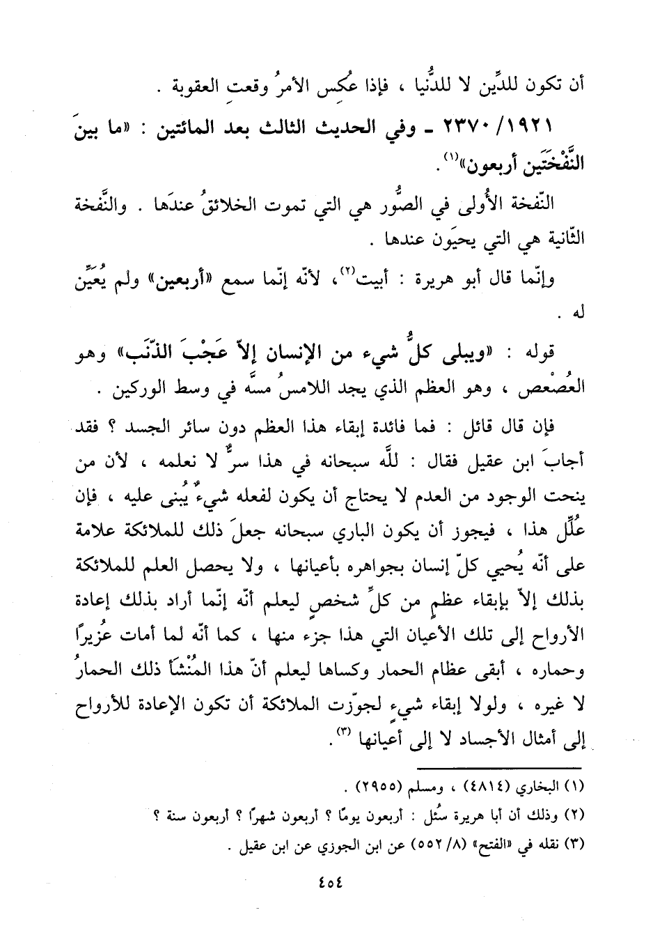 فَإِن قَالَ قَائِل: فَمَا فَائِدَة إبْقَاء هَذَا الْعظم دون سَائِر الْجَسَد؟ فقد أجَاب ابْن عقيل فَقَالَ: لله سُبْحَانَهُ فِي هَذَا سر لَا نعلمهُ، لِأَن من ينحت الْوُجُود من الْعَدَم لَا يحْتَاج أَن يكون لفعله شَيْء يبْنى عَلَيْهِ، فَإِن علل هَذَا، فَيجوز أَن يكون الْبَارِي سُبْحَانَهُ جعل ذَلِك للْمَلَائكَة عَلامَة على أَنه يحيي كل إِنْسَان بجواهره بِأَعْيَانِهَا، وَلَا يحصل الْعلم للْمَلَائكَة بذلك إِلَّا بإبقاء عظم من كل شخص ليعلم أَنه إِنَّمَا أَرَادَ بذلك إِعَادَة الْأَرْوَاح إِلَى تِلْكَ الْأَعْيَان الَّتِي هَذَا جُزْء مِنْهَا، كَمَا أَنه لما أمات عُزَيْرًا وَحِمَاره، أبقى عِظَام الْحمار وَكَسَاهَا ليعلم أَن هَذَا المنشأ ذَلِك الْحمار لَا غَيره، وَلَوْلَا إبْقَاء شَيْء لجوزت الْمَلَائِكَة أَن تكون الْإِعَادَة للأرواح إِلَى أَمْثَال الأجساد لَا إِلَى أعيانها.