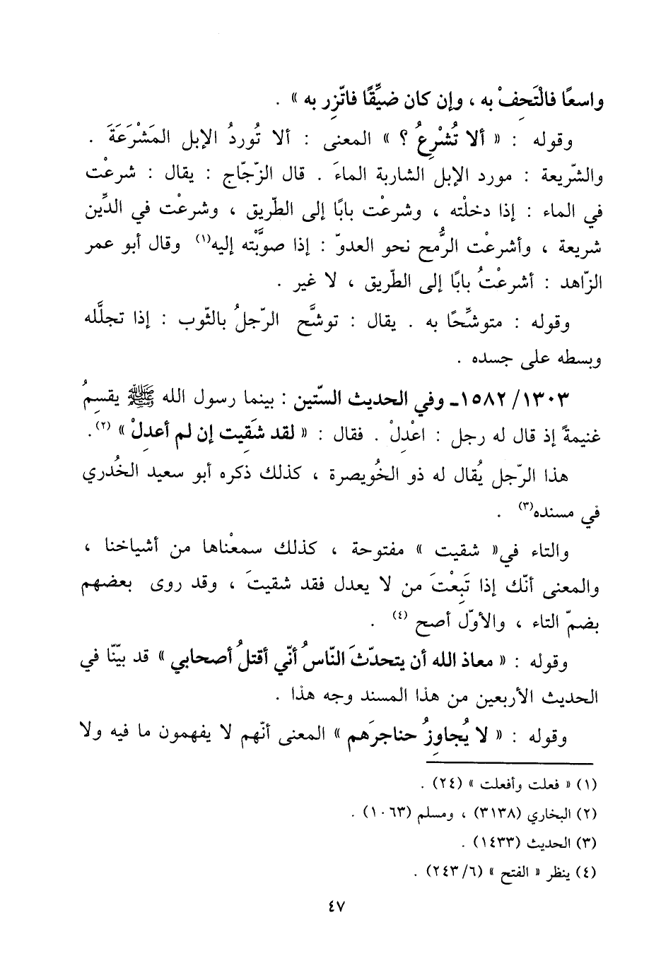 1303 - / 1582 - وَفِي الحَدِيث السِّتين: بَيْنَمَا رَسُول الله صلى الله عَلَيْهِ وَسلم يقسم غنيمَة إِذْ قَالَ لَهُ رجل: اعْدِلْ. فَقَالَ ((لقد شقيت إِن لم أعدل)) .