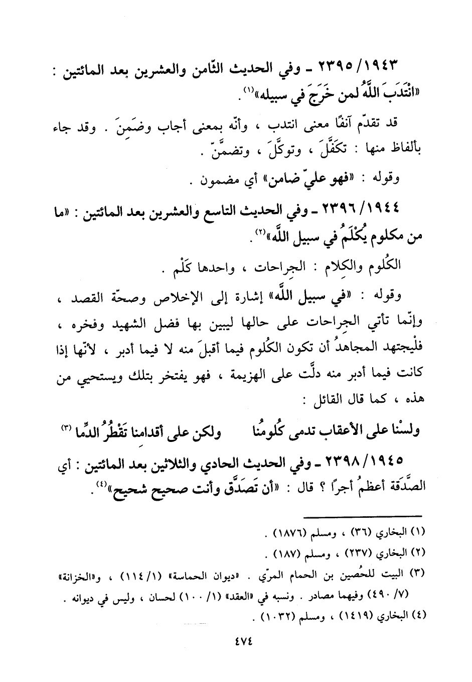 1944 - / 2396 - وَفِي الحَدِيث التَّاسِع وَالْعِشْرين بعد الْمِائَتَيْنِ: ((مَا من مكلوم يكلم فِي سَبِيل الله)) .