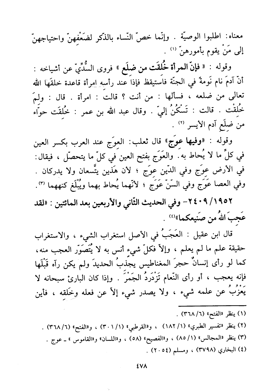 وَقَوله: ((فَإِن الْمَرْأَة خلقت من ضلع)) فروى السّديّ عَن أشياخه: أَن آدم نَام نومَة فِي الْجنَّة فَاسْتَيْقَظَ فَإِذا عِنْد رَأسه امْرَأَة قَاعِدَة خلقهَا الله تَعَالَى من ضلعه، فَسَأَلَهَا: من أَنْت؟ قَالَت: امْرَأَة. قَالَ: وَلم خلقت. قَالَت: تسكن إِلَيّ. وَقَالَ عبد الله بن عمر: خلقت حَوَّاء من ضلع آدم الْأَيْسَر.