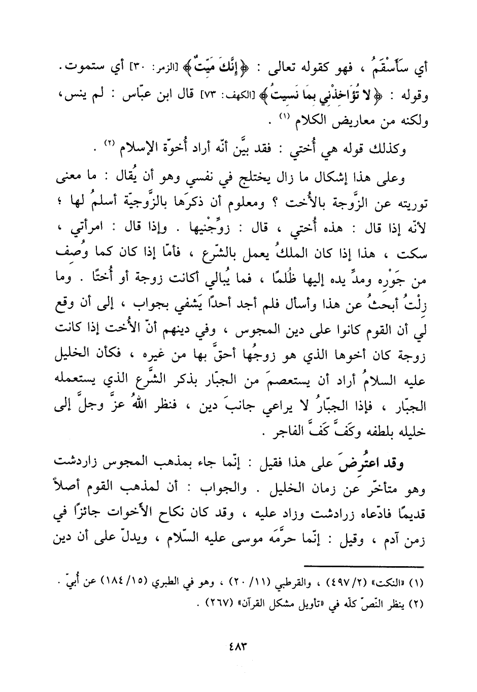 وَقد اعْترض على هَذَا فَقيل: إِنَّمَا جَاءَ بِمذهب الْمَجُوس زاردشت وَهُوَ مُتَأَخّر عَن زمَان الْخَلِيل. وَالْجَوَاب: أَن لمَذْهَب الْقَوْم أصلا قَدِيما فَادَّعَاهُ زرادشت وَزَاد عَلَيْهِ، وَقد كَانَ نِكَاح الْأَخَوَات جَائِزا فِي زمن آدم، وَقيل: إِنَّمَا حرمه مُوسَى عَلَيْهِ السَّلَام، وَيدل على أَن دين
