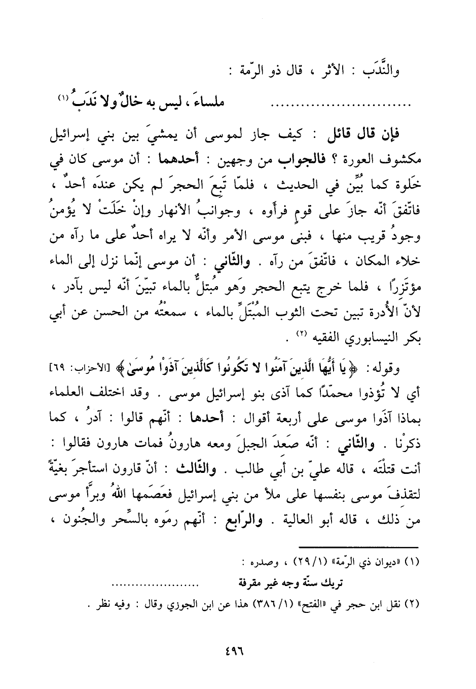 فَإِن قَالَ قَائِل: كَيفَ جَازَ لمُوسَى أَن يمشي بَين بني إِسْرَائِيل مَكْشُوف الْعَوْرَة؟ فَالْجَوَاب من وَجْهَيْن: أَحدهمَا: أَن مُوسَى كَانَ فِي خلْوَة كَمَا بَين فِي الحَدِيث، فَلَمَّا تبع الْحجر لم يكن عِنْده أحد، فاتفق أَنه جَازَ على قوم فرأوه، وجوانب الْأَنْهَار وَإِن خلت لَا يُؤمن وجود قريب مِنْهَا، فَبنى مُوسَى الْأَمر وَأَنه لَا يرَاهُ أحد على مَا رَآهُ من خلاء الْمَكَان، فاتفق من رَآهُ. وَالثَّانِي: أَن مُوسَى إِنَّمَا نزل إِلَى المَاء مؤتزرا، فَلَمَّا خرج يتبع الْحجر وَهُوَ مبتل بِالْمَاءِ تبين أَنه لَيْسَ بآدر، لِأَن الأدرة تبين تَحت الثَّوْب المبتل بِالْمَاءِ، سمعته من الْحسن عَن أبي بكر النَّيْسَابُورِي الْفَقِيه.