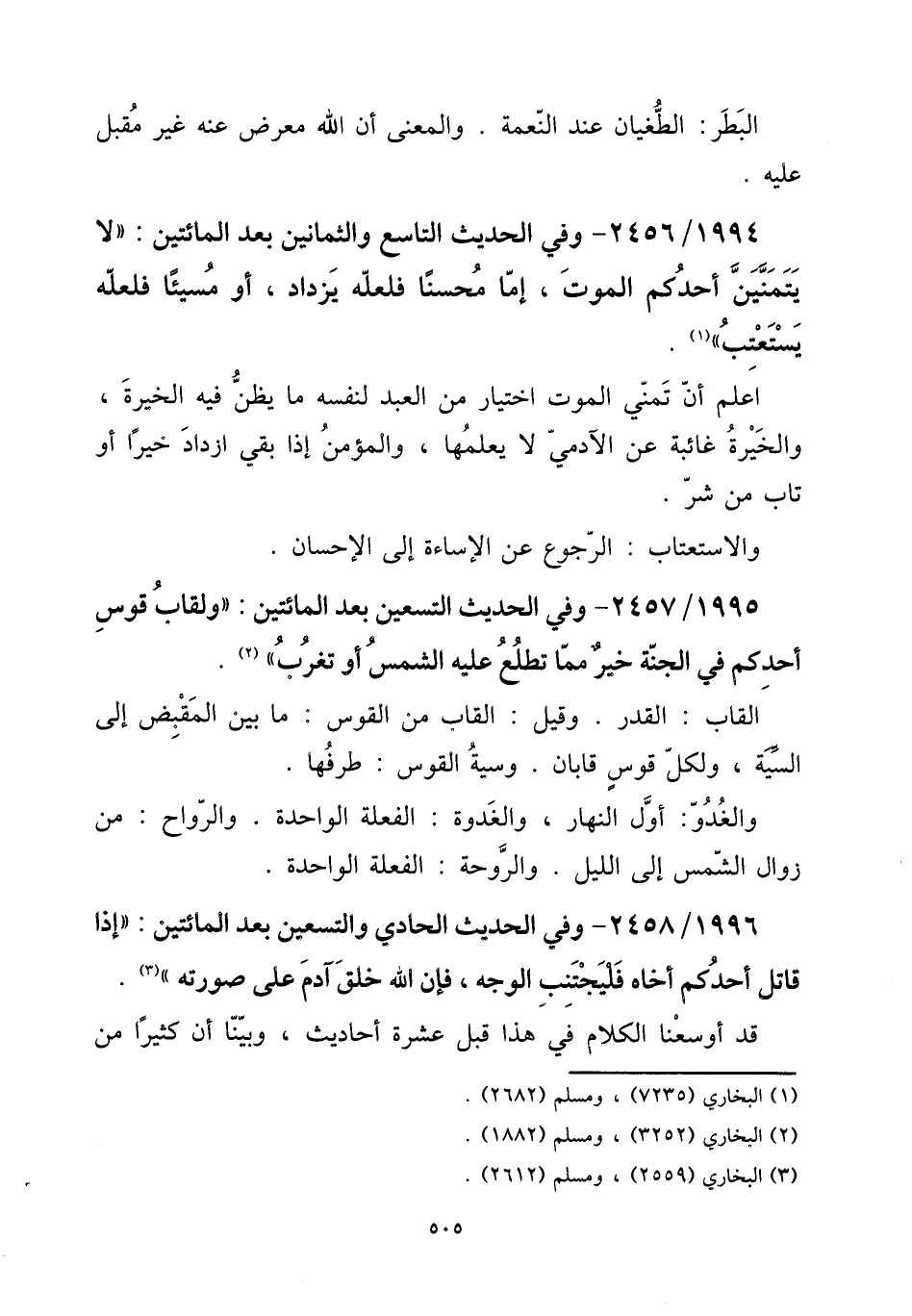 1994 - / 2456 - وَفِي الحَدِيث التَّاسِع والثمانين بعد الْمِائَتَيْنِ: ((لَا يتمنين أحدكُم الْمَوْت، إِمَّا محسنا فَلَعَلَّهُ يزْدَاد، أَو مسيئا فَلَعَلَّهُ يستعتب)) .