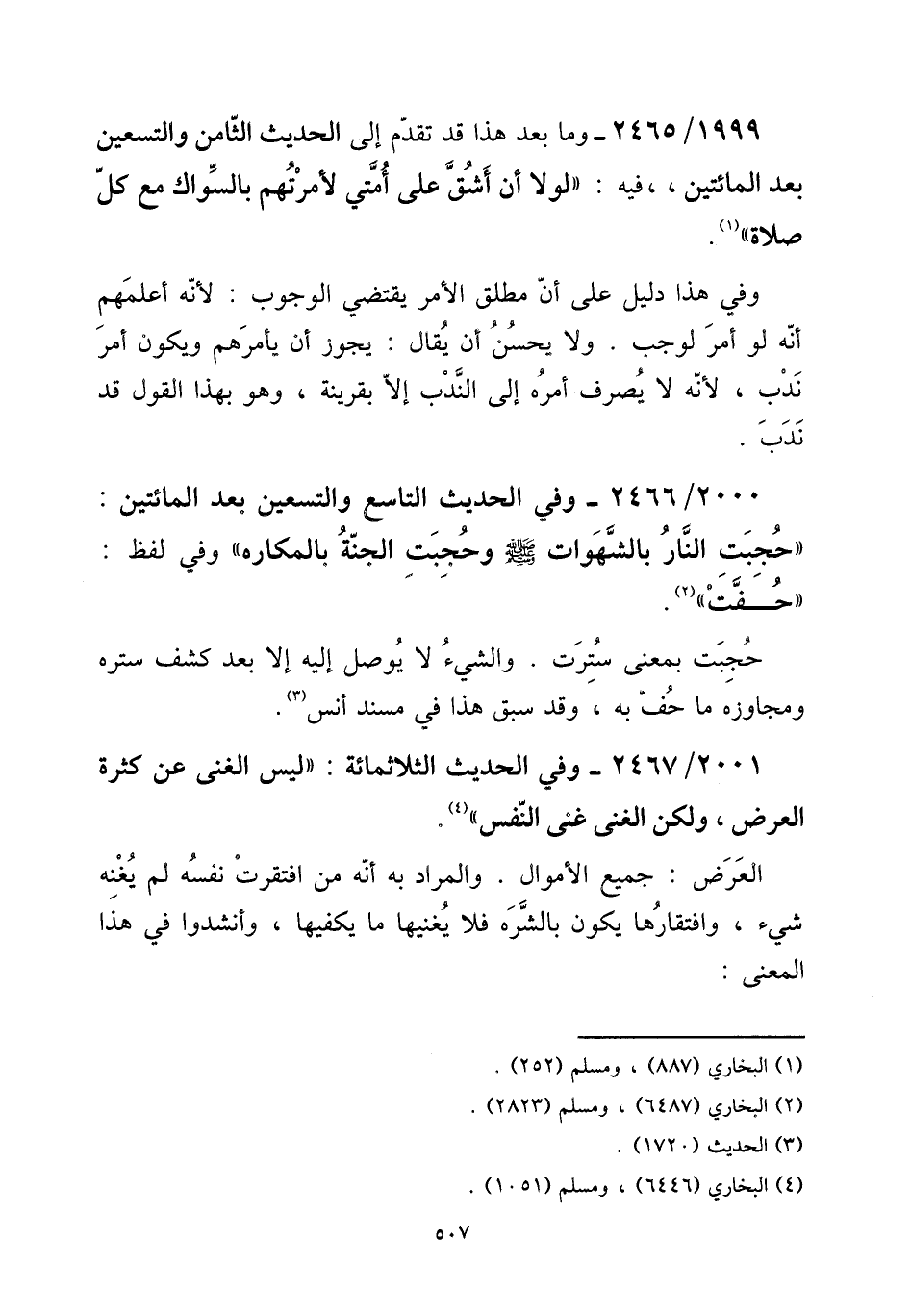 2000 - / 2466 - وَفِي الحَدِيث التَّاسِع وَالتسْعين بعد الْمِائَتَيْنِ: ((حجبت النَّار بالشهوات صلى الله عَلَيْهِ وَسلم وحجبت الْجنَّة بالمكاره)) وَفِي لفظ: ((حفت)) .