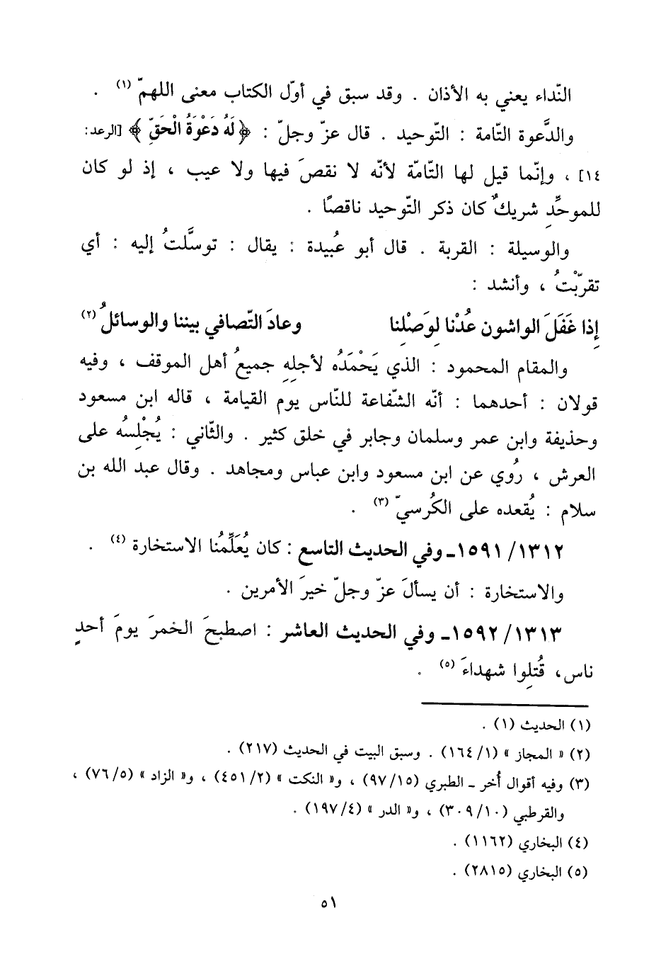 وَالْمقَام الْمَحْمُود: الَّذِي يحمده لأَجله جَمِيع أهل الْموقف، وَفِيه قَولَانِ: أَحدهمَا: أَنه الشَّفَاعَة للنَّاس يَوْم الْقِيَامَة، قَالَه ابْن مَسْعُود وَحُذَيْفَة وَابْن عمر وسلمان وَجَابِر فِي خلق كثير. وَالثَّانِي: يجلسه على الْعَرْش، رُوِيَ عَن ابْن مَسْعُود وَابْن عَبَّاس وَمُجاهد. وَقَالَ عبد الله بن سَلام: يقعده على الْكُرْسِيّ. 1312 / 1591 - وَفِي الحَدِيث التَّاسِع: كَانَ يعلمنَا الاستخارة. والاستخارة: أَن يسْأَل عز وَجل خير الْأَمريْنِ.