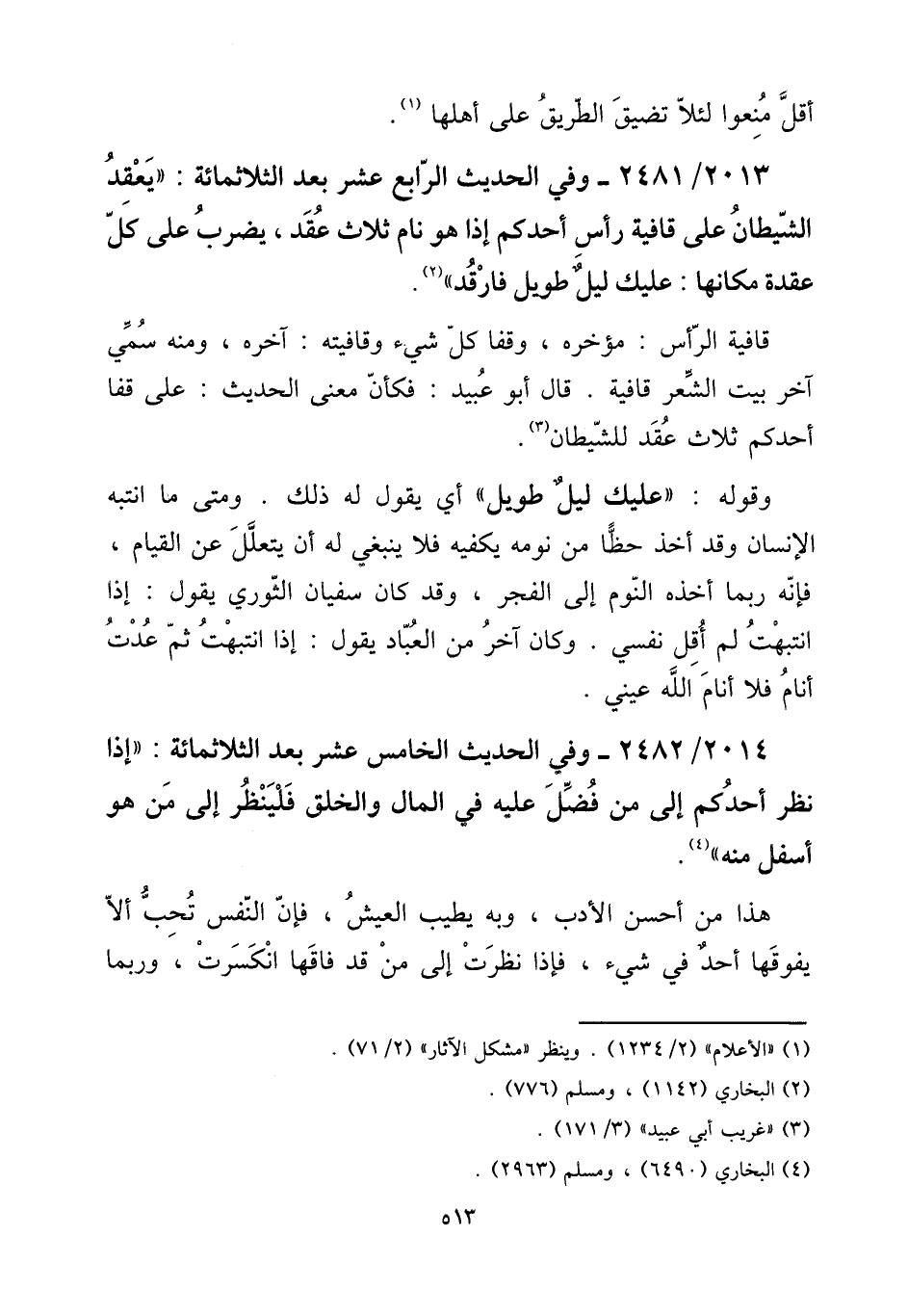 2013 - / 2481 - وَفِي الحَدِيث الرَّابِع عشر بعد الثلاثمائة: ((يعْقد الشَّيْطَان على قافية رَأس أحدكُم إِذا هُوَ نَام ثَلَاث عقد، يضْرب على كل عقدَة مَكَانهَا: عَلَيْك ليل طَوِيل فارقد)) .
