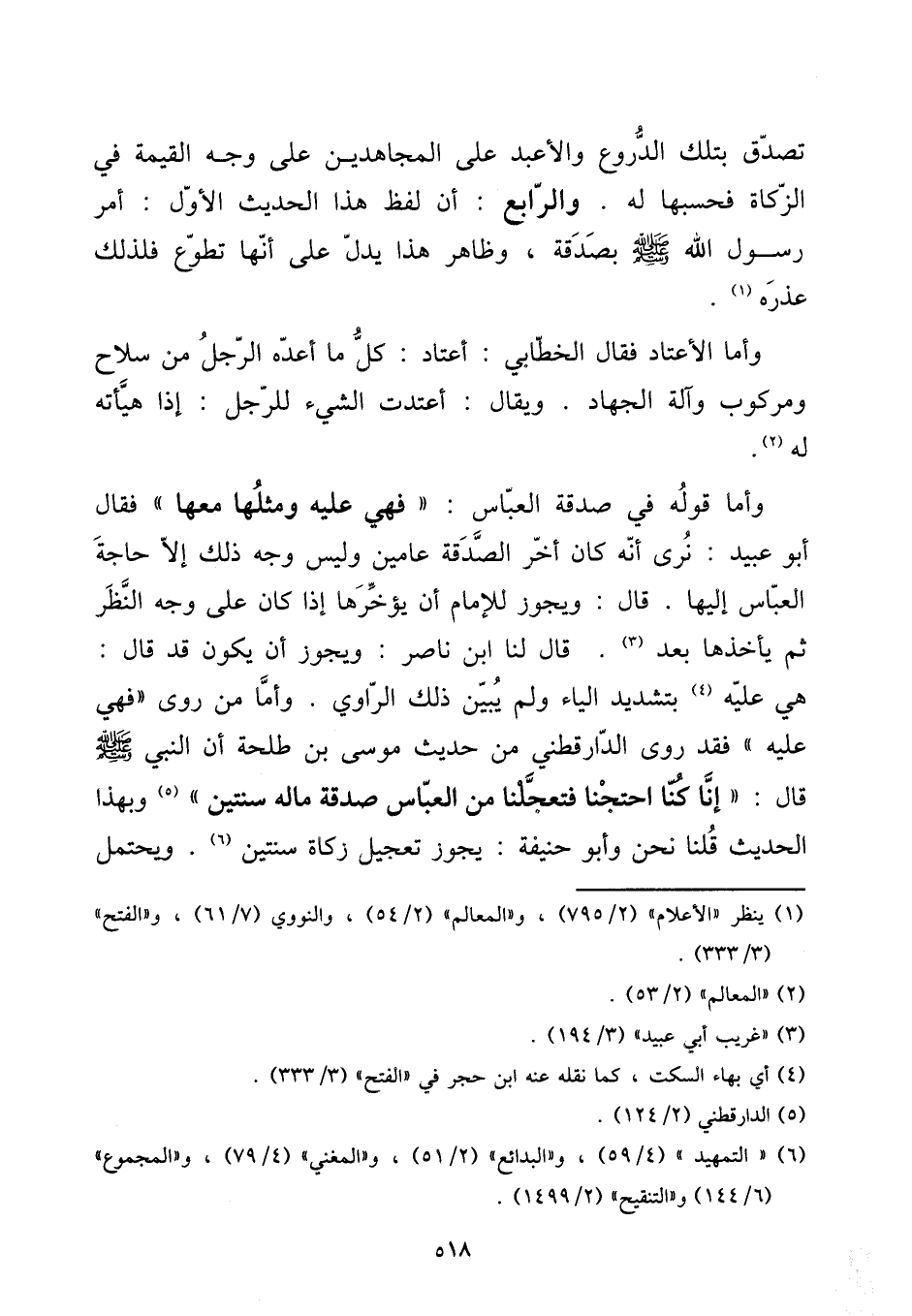 وَأما قَوْله فِي صَدَقَة الْعَبَّاس: ((فَهِيَ عَلَيْهِ وَمثلهَا مَعهَا)) فَقَالَ أَبُو عبيد: نرى أَنه كَانَ أخر الصَّدَقَة عَاميْنِ وَلَيْسَ وَجه ذَلِك إِلَّا حَاجَة الْعَبَّاس إِلَيْهَا. قَالَ: وَيجوز للْإِمَام أَن يؤخرها إِذا كَانَ على وَجه النّظر ثمَّ يَأْخُذهَا بعد. قَالَ لنا ابْن نَاصِر: وَيجوز أَن يكون قد قَالَ: هِيَ عَلَيْهِ بتَشْديد الْيَاء وَلم يبين ذَلِك الرَّاوِي. وَأما من روى ((فَهِيَ عَلَيْهِ)) فقد روى الدَّارَقُطْنِيّ من حَدِيث مُوسَى بن طَلْحَة أَن النَّبِي صلى الله عَلَيْهِ وَسلم قَالَ: ((إِنَّا كُنَّا احتجنا فتعجلنا من الْعَبَّاس صَدَقَة مَاله سنتَيْن)) وَبِهَذَا الحَدِيث قُلْنَا نَحن وَأَبُو حنيفَة: يجوز تَعْجِيل زَكَاة سنتَيْن. وَيحْتَمل