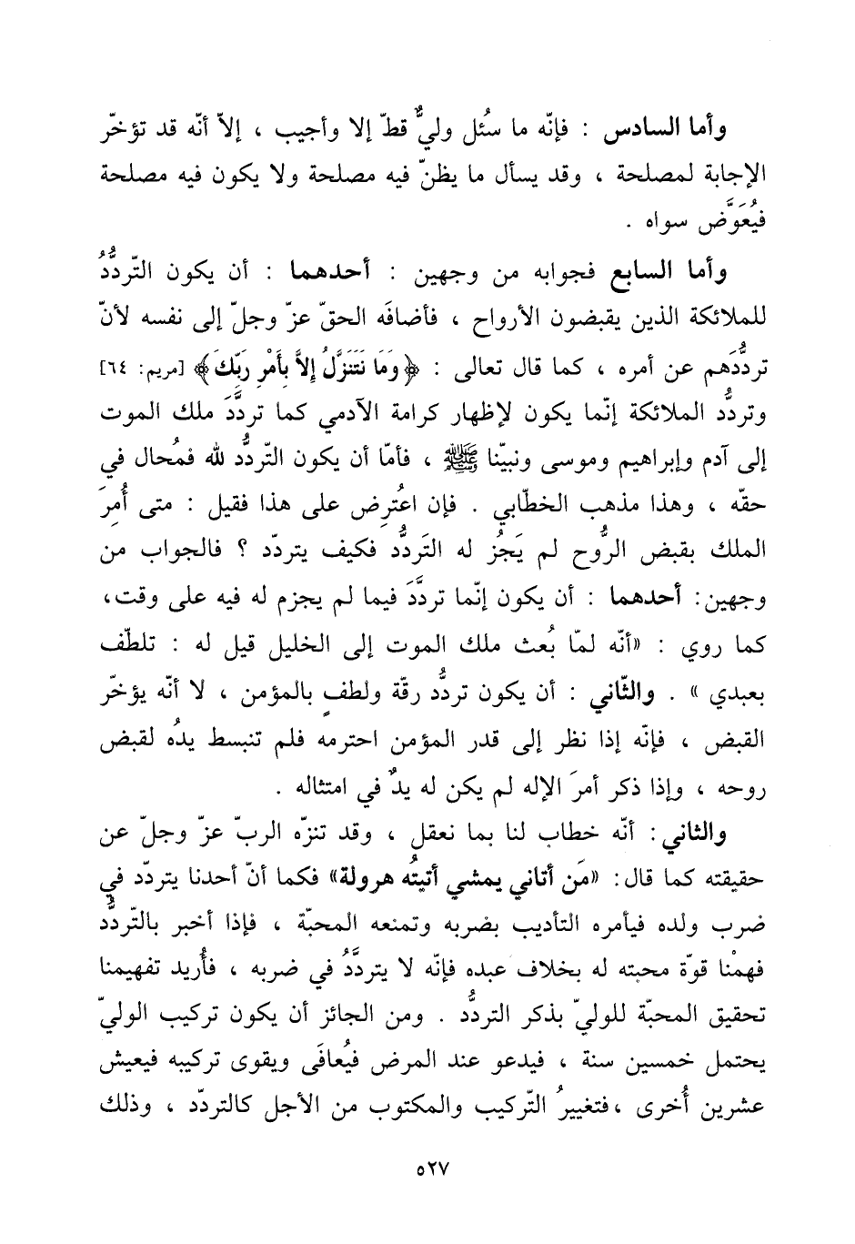 وَالثَّانِي: أَنه خطاب لنا بِمَا نعقل، وَقد تنزه الرب عز وَجل عَن حَقِيقَته كَمَا قَالَ: ((من أَتَانِي يمشي أَتَيْته هرولة)) فَكَمَا أَن أَحَدنَا يتَرَدَّد فِي ضرب وَلَده فيأمره التَّأْدِيب بضربه وتمنعه الْمحبَّة، فَإِذا أخبر بالتردد فهمنا قُوَّة محبته لَهُ بِخِلَاف عَبده فَإِنَّهُ لَا يتَرَدَّد فِي ضربه، فَأُرِيد تفهيمنا تَحْقِيق الْمحبَّة للْوَلِيّ بِذكر التَّرَدُّد. وَمن الْجَائِز أَن يكون تركيب الْوَلِيّ يحْتَمل خمسين سنة، فيدعو عِنْد الْمَرَض فيعافى ويقوى تركيبه فيعيش عشْرين أُخْرَى، فتغيير التَّرْكِيب والمكتوب من الْأَجَل كالتردد، وَذَلِكَ