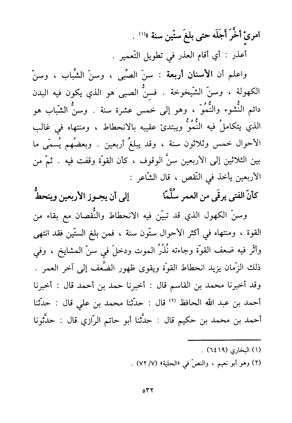 وَاعْلَم أَن الْأَسْنَان أَرْبَعَة: سنّ الصَّبِي، وَسن الشَّبَاب، وَسن الكهولة، وَسن الشيخوخة. فسن الصَّبِي هُوَ الَّذِي يكون فِيهِ الْبدن دَائِم النشوء والنمو، وَهُوَ إِلَى خمس عشرَة سنة. وَسن الشَّبَاب هُوَ الَّذِي يتكامل فِيهِ النمو ويبتدئ عَقِيبه بالإنحطاط، ومنتهاه فِي غَالب الْأَحْوَال خمس وَثَلَاثُونَ سنة، وَقد يبلغ أَرْبَعِينَ. وَبَعْضهمْ يُسمى مَا بَين الثَّلَاثِينَ إِلَى الْأَرْبَعين سنّ الْوُقُوف، كَأَن الْقُوَّة وقفت فِيهِ. ثمَّ من الْأَرْبَعين يَأْخُذ فِي النَّقْص، قَالَ الشَّاعِر: