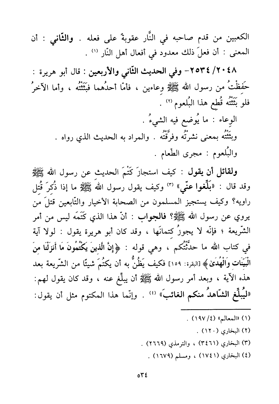 2048 - / 2534 - وَفِي الحَدِيث الثَّانِي وَالْأَرْبَعِينَ: قَالَ أَبُو هُرَيْرَة: حفظت من رَسُول الله صلى الله عَلَيْهِ وَسلم وعاءين، فَأَما أَحدهمَا فبثثته، وَأما الآخر فَلَو بثثته قطع هَذَا البلعوم)) .