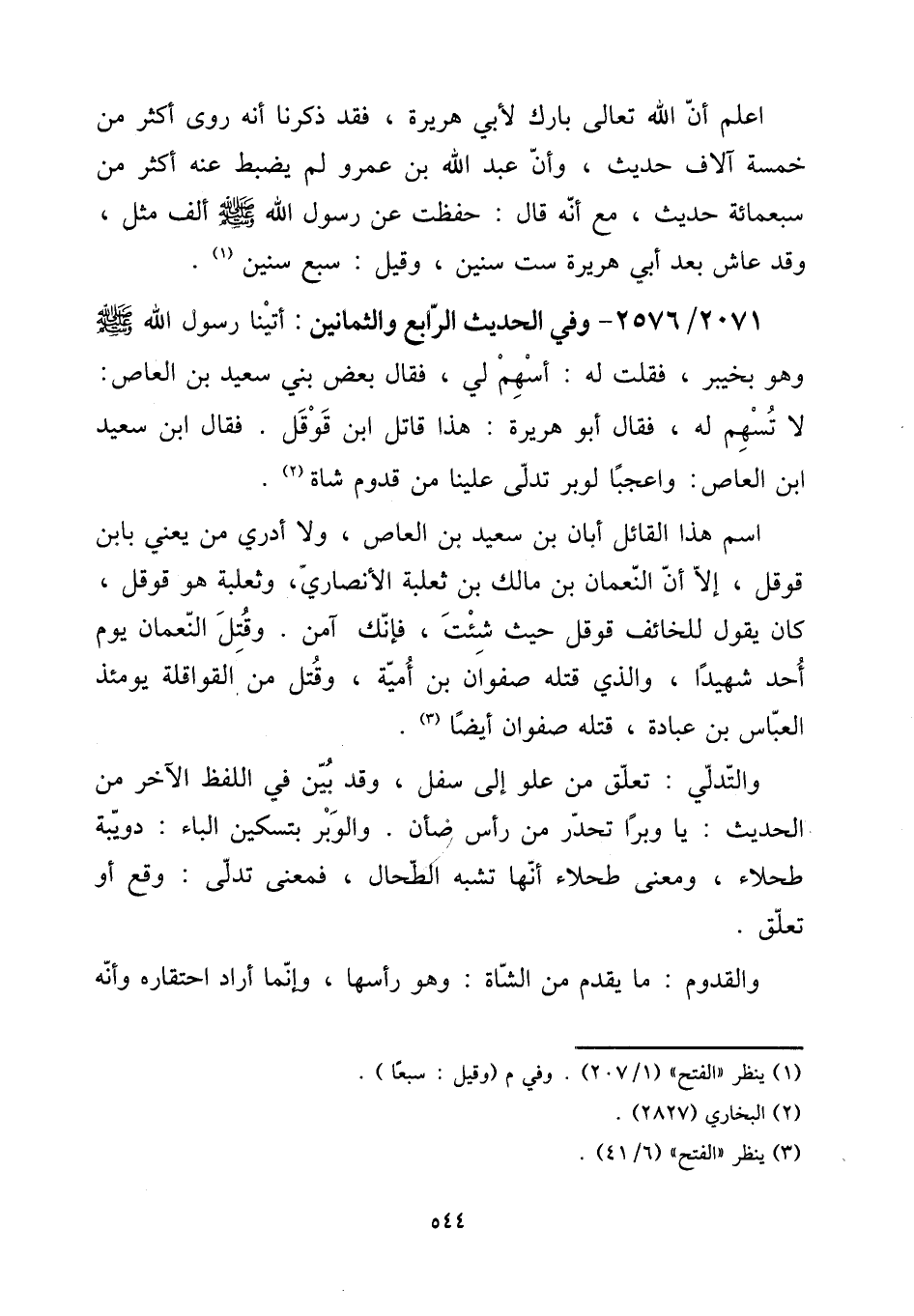 2071 - / 2576 - وَفِي الحَدِيث الرَّابِع والثمانين: أَتَيْنَا رَسُول الله صلى الله عَلَيْهِ وَسلم وَهُوَ بِخَيْبَر، فَقلت لَهُ: أسْهم لي، فَقَالَ بعض بني سعيد بن الْعَاصِ: لَا تسهم لَهُ، فَقَالَ أَبُو هُرَيْرَة: هَذَا قَاتل ابْن قوقل. فَقَالَ ابْن سعيد ابْن الْعَاصِ: وَاعجَبا لوبر تدلى علينا من قدوم شَاة.