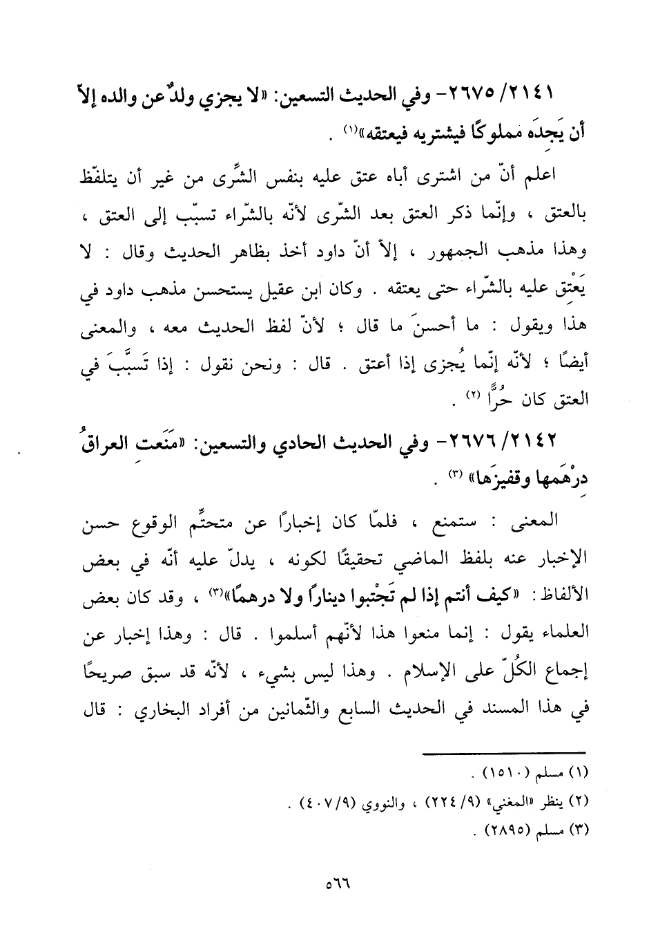 2141 - / 2675 - وَفِي الحَدِيث التسعين: ((لَا يَجْزِي ولد عَن وَالِده إِلَّا أَن يجده مَمْلُوكا فيشتريه فيعتقه)) .
