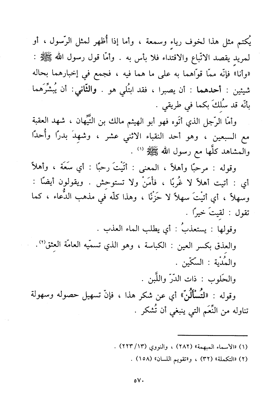 وَأما الرجل الَّذِي أَتَوْهُ فَهُوَ أَبُو الْهَيْثَم مَالك بن التيهَان، شهد الْعقبَة مَعَ السّبْعين، وَهُوَ أحد النُّقَبَاء الإثني عشر، وَشهد بَدْرًا وأحدا والمشاهد كلهَا مَعَ رَسُول الله صلى الله عَلَيْهِ وَسلم.