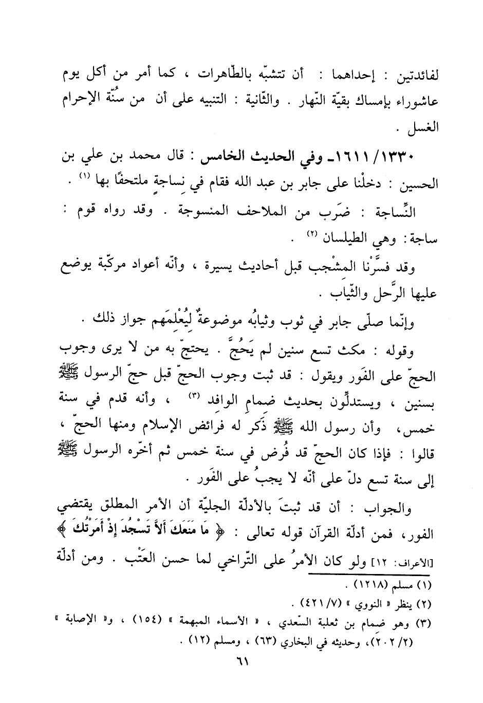 وَقَوله: مكث تسع سِنِين لم يحجّ. يحْتَج بِهِ من لَا يرى وجوب الْحَج على الْفَوْر وَيَقُول: قد ثَبت وجوب الْحَج قبل حج الرَّسُول صلى الله عَلَيْهِ وَسلم بسنين، ويستدلون بِحَدِيث ضمام الْوَافِد، وَأَنه قدم فِي سنة خمس، وَأَن رَسُول الله صلى الله عَلَيْهِ وَسلم ذكر لَهُ فَرَائض الْإِسْلَام وَمِنْهَا الْحَج، قَالُوا: فَإِذا كَانَ الْحَج قد فرض فِي سنة خمس ثمَّ أَخّرهُ الرَّسُول صلى الله عَلَيْهِ وَسلم إِلَى سنة تسع دلّ على أَنه لَا يجب على الْفَوْر.