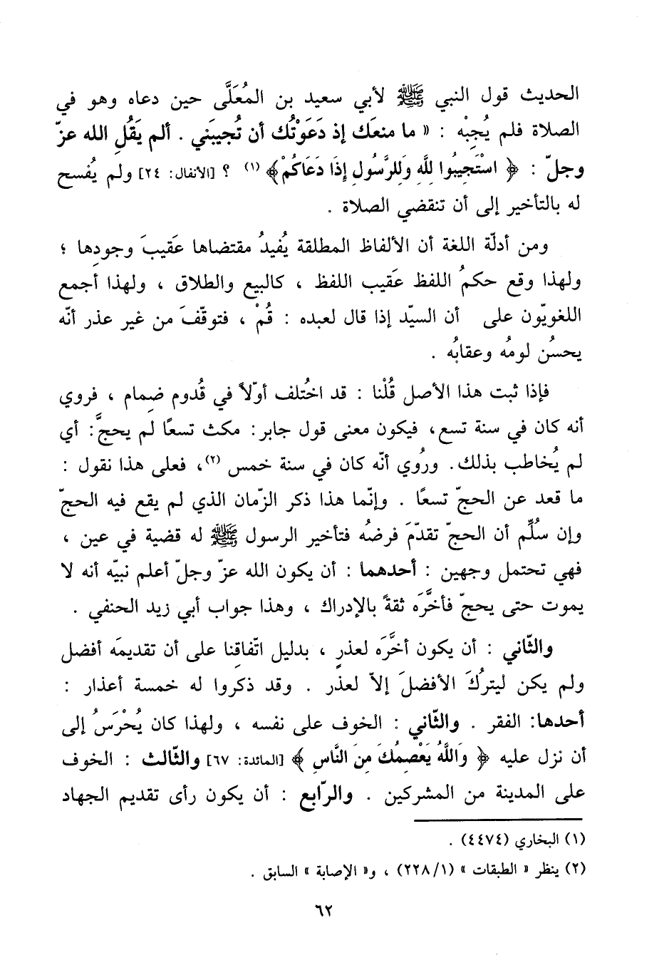 الحَدِيث قَول النَّبِي صلى الله عَلَيْهِ وَسلم لأبي سعيد بن الْمُعَلَّى حِين دَعَاهُ وَهُوَ فِي الصَّلَاة فَلم يجبهُ: ((مَا مَنعك إِذْ دعوتك أَن تُجِيبنِي. ألم يقل الله عز وَجل: {اسْتجِيبُوا لله وَلِلرَّسُولِ إِذا دعَاكُمْ} ؟ [الْأَنْفَال: 24] وَلم يفسح لَهُ بِالتَّأْخِيرِ إِلَى أَن تَنْقَضِي الصَّلَاة.