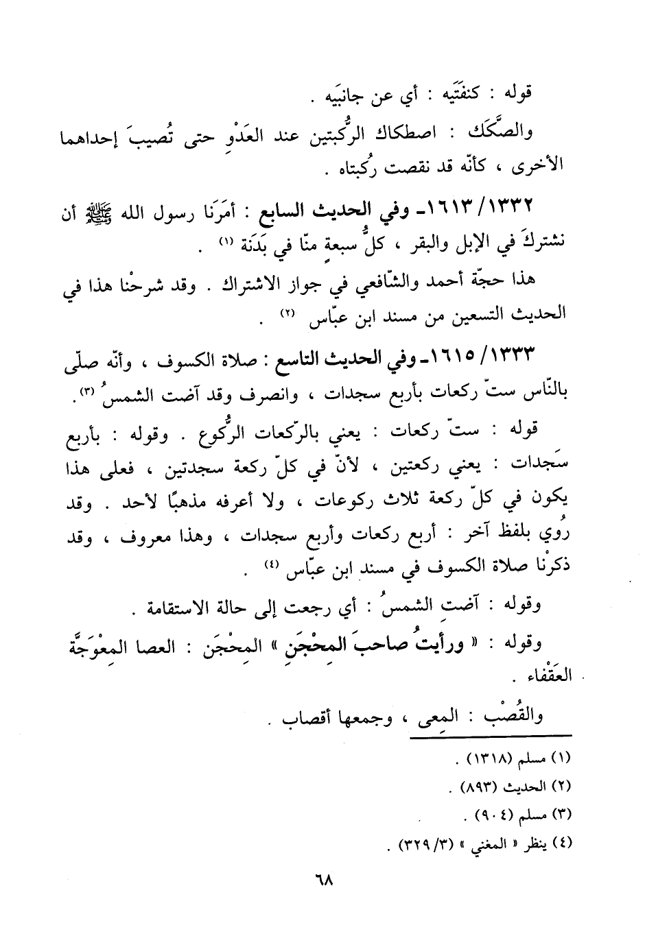 1333 - / 1615 - وَفِي الحَدِيث التَّاسِع: صَلَاة الْكُسُوف، وَأَنه صلى بِالنَّاسِ سِتّ رَكْعَات بِأَرْبَع سَجدَات، وَانْصَرف وَقد آضت الشَّمْس.