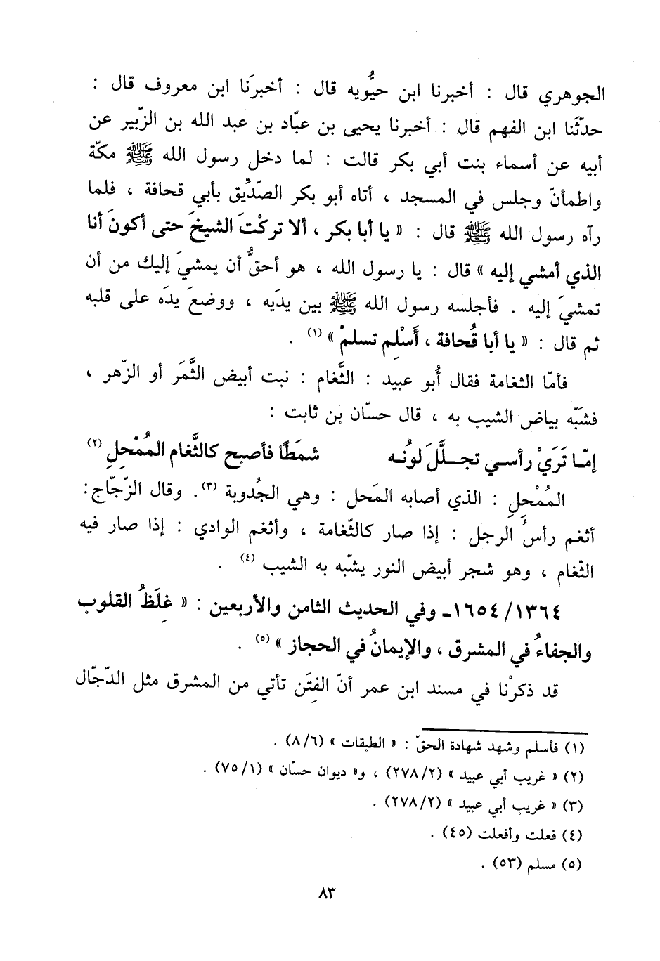 حَدثنَا ابْن الْفَهم قَالَ: أخبرنَا يحيى بن عباد بن عبد الله بن الزبير عَن أَبِيه عَن أَسمَاء بنت أبي بكر قَالَت: لما دخل رَسُول الله صلى الله عَلَيْهِ وَسلم مَكَّة وَاطْمَأَنَّ وَجلسَ فِي الْمَسْجِد، أَتَاهُ أَبُو بكر الصّديق بِأبي قُحَافَة، فَلَمَّا رَآهُ رَسُول الله صلى الله عَلَيْهِ وَسلم قَالَ: ((يَا أَبَا بكر، أَلا تركت الشَّيْخ حَتَّى أكون أَنا الَّذِي أَمْشِي إِلَيْهِ)) قَالَ: يَا رَسُول الله، هُوَ أَحَق أَن يمشي إِلَيْك من أَن تمشي إِلَيْهِ. فأجلسه رَسُول الله صلى الله عَلَيْهِ وَسلم بَين يَدَيْهِ، وَوضع يَده على قلبه ثمَّ قَالَ: ((يَا أَبَا قُحَافَة، أسلم تسلم)) .