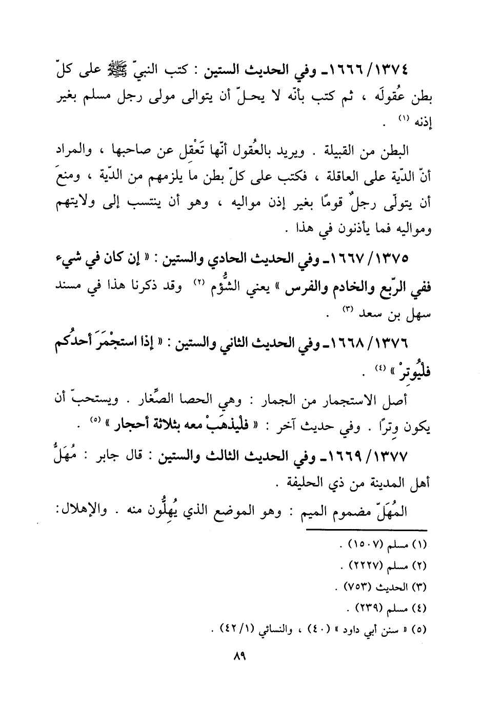 1374 - / 1666 - وَفِي الحَدِيث السِّتين: كتب النَّبِي صلى الله عَلَيْهِ وَسلم على كل بطن عقوله، ثمَّ كتب بِأَنَّهُ لَا يحل أَن يتوالى مولى رجل مُسلم بِغَيْر إِذْنه.