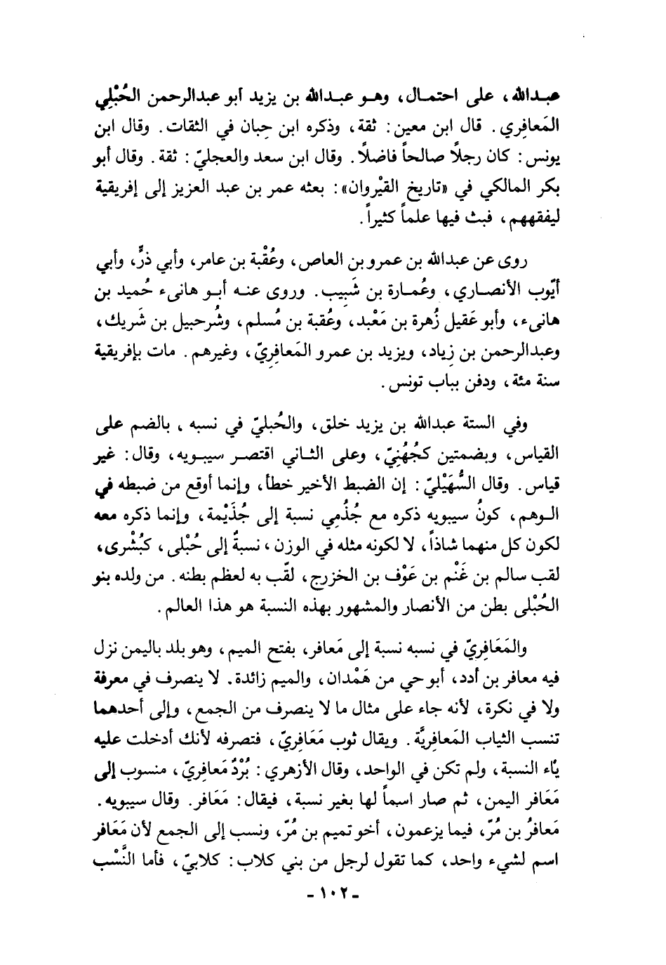 عبد الله، على احتمال، وهو عبد الله بن يزيد أبو عبد الرحمن الحُبْلِي المَعافِري. قال ابن معين: ثقة، وذكره ابن حِبان في الثقات. وقال ابن يونس: كان رجلًا صالحًا فاضلًا. وقال ابن سعد والعجليّ: ثقة. وقال أبو بكر المالكي في "تاريخ القيْروان": بعثه عمر بن عبد العزيز إلى إفريقية ليفقههم، فبث فيها علمًا كثيرًا.