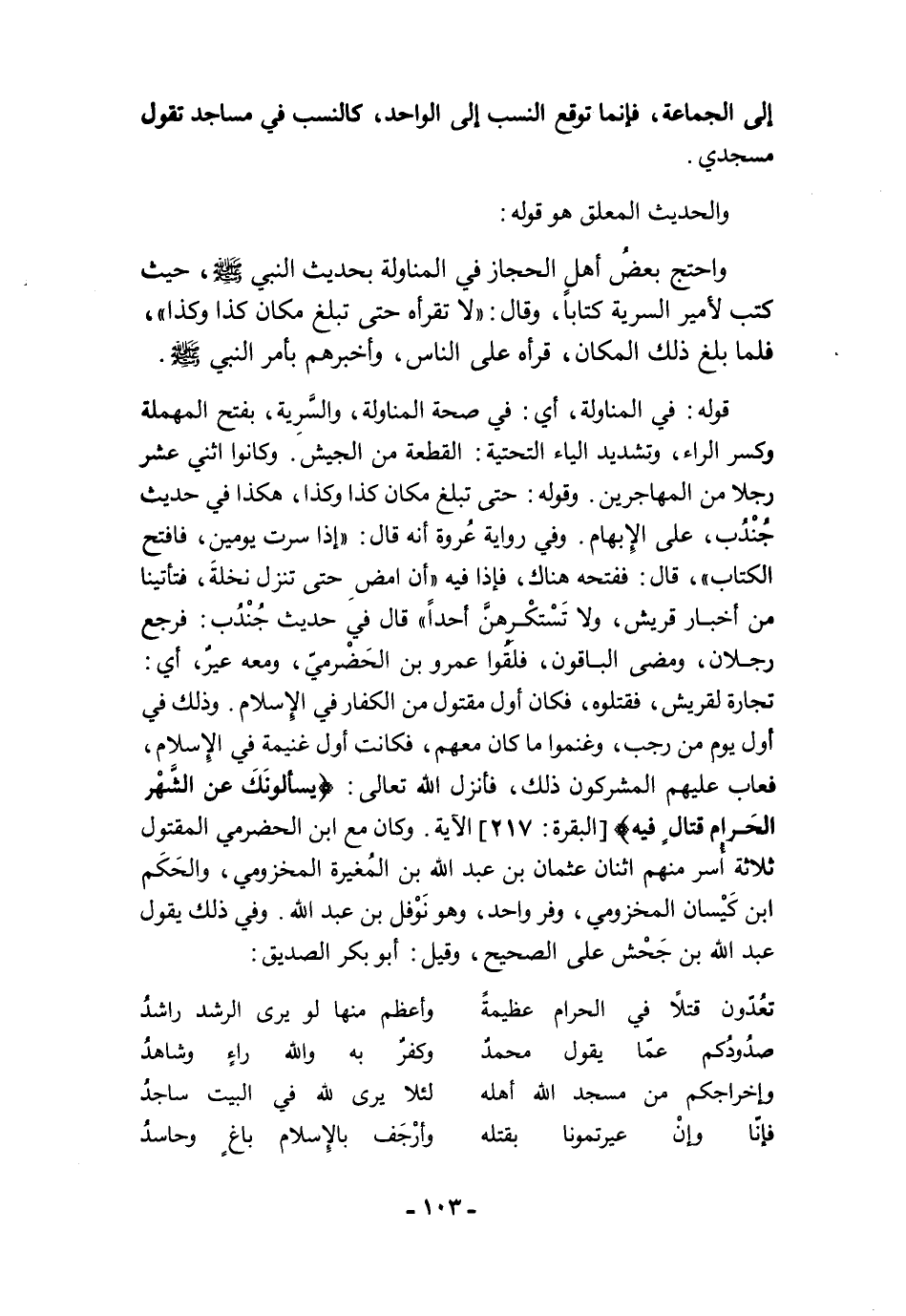 قوله: في المناولة، أي: في صحة المناولة، والسَّرِية، بفتح المهملة وكسر الراء، وتشديد الياء التحتية: القطعة من الجيش. وكانوا اثني عشر رجلا من المهاجرين. وقوله: حتى تبلغ مكان كذا وكذا، هكذا في حديث جُنْدُب، على الإِبهام. وفي رواية عُروة أنه قال: "إذا سرت يومين، فافتح الكتاب"، قال: ففتحه هناك، فإذا فيه "أن امضِ حتى تنزل نخلةَ، فتأتينا من أخبار قريش، ولا تَسْتكْرهنَّ أحدًا" قال في حديث جُنْدُب: فرجع رجلان، ومضى الباقون، فلَقُوا عمرو بن الحَضْرميّ، ومعه عيرٌ، أي: تجارة لقريش، فقتلوه، فكان أول مقتول من الكفار في الإِسلام. وذلك في أول يوم من رجب، وغنموا ما كان معهم، فكانت أول غنيمة في الإِسلام، فعاب عليهم المشركون ذلك، فأنزل الله تعالى: {يَسْأَلُونَكَ عَنِ الشَّهْرِ الْحَرَامِ قِتَالٍ فِيهِ} [البقرة: 217] الآية. وكان مع ابن الحضرمي المقتول ثلاثة أُسر منهم اثنان عثمان بن عبد الله بن المُغيرة المخزومي، والحَكَم ابن كَيْسان المخزومي، وفر واحد، وهو نَوْفل بن عبد الله. وفي ذلك يقول عبد الله بن جَحْش على الصحيح، وقيل: أبو بكر الصديق: