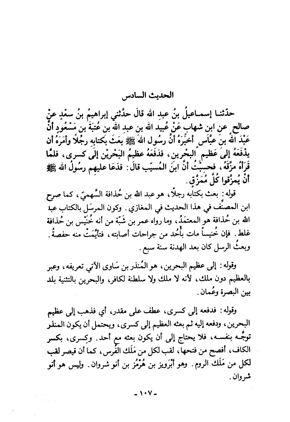 حَدَّثَنَا إِسْمَاعِيلُ بْنُ عَبْدِ اللَّهِ قَالَ حَدَّثَنِى إِبْرَاهِيمُ بْنُ سَعْدٍ عَنْ صَالِحٍ عَنِ ابْنِ شِهَابٍ عَنْ عُبَيْدِ اللَّهِ بْنِ عَبْدِ اللَّهِ بْنِ عُتْبَةَ بْنِ مَسْعُودٍ أَنَّ عَبْدَ اللَّهِ بْنَ عَبَّاسٍ أَخْبَرَهُ أَنَّ رَسُولَ اللَّهِ -صلى الله عليه وسلم- بَعَثَ بِكِتَابِهِ رَجُلاً، وَأَمَرَهُ أَنْ يَدْفَعَهُ إِلَى عَظِيمِ الْبَحْرَيْنِ، فَدَفَعَهُ عَظِيمُ الْبَحْرَيْنِ إِلَى كِسْرَى، فَلَمَّا قَرَأَهُ مَزَّقَهُ. فَحَسِبْتُ أَنَّ ابْنَ الْمُسَيَّبِ قَالَ فَدَعَا عَلَيْهِمْ رَسُولُ اللَّهِ -صلى الله عليه وسلم- أَنْ يُمَزَّقُوا كُلَّ مُمَزَّقٍ.
