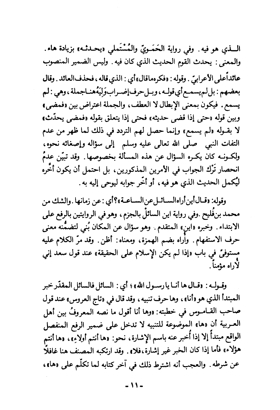 الذي هو فيه. وفي رواية الحَمَويّ والمُسْتَملي "يحدثه" بزيادة هاء. والمعنى: يحدث القوم الحديث الذي كان فيه. وليس الضمير المنصوب عائدًا على الأعرابيّ. وقوله: "فكره ما قال" أي: الذي قاله، فحذف العائد. وقال بعضهم: بل لم يسمع أي قوله، وبل حرف إِضراب وَلِيَهُ هنا جملة، وهي: لم يسمع. فيكون بمعنى الإبطال لا العطف، والجملة اعتراض بين "فمضى" وبين قوله "حتى إِذا قضى حديثه" فحتى إِذا يتعلق بقوله "فمضى يحدّث" لا بقوله "لم يسمع" وإنما حصل لهم التردد في ذلك لما ظهر من عدم التفات النبي صلى الله تعالى عليه وسلم إِلى سؤاله وإصغائه نحوه، ولكونه كان يكره السؤال عن هذه المسألة بخصوصها. وقد تبيّن عدمُ انحصار تَرْك الجواب في الأمرين المذكورين، بل احتمل أن يكون أخَّره ليُكمل الحديث الذي هو فيه، أو أخّر جوابه ليوحى إِليه به.